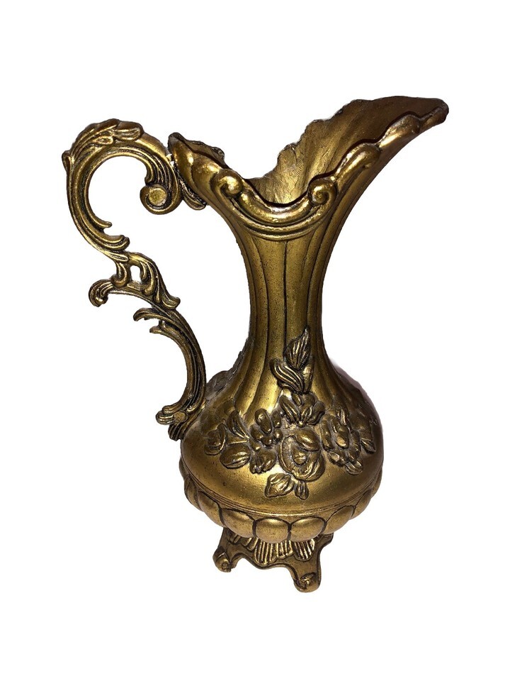 This vintage Italy footed brass pitcher is a charming ornate floral bud vase, standing at 7 inches tall. Made in Italy, this pitcher features intricate detailing and a beautiful floral design that adds a touch of elegance to any space. Perfect for collectors of metalware or those looking to add a unique vintage piece to their home decor.