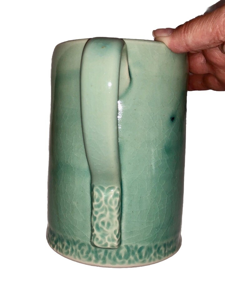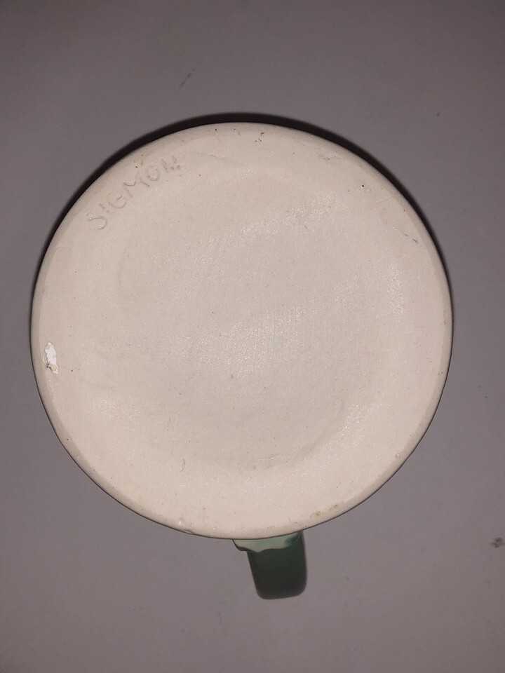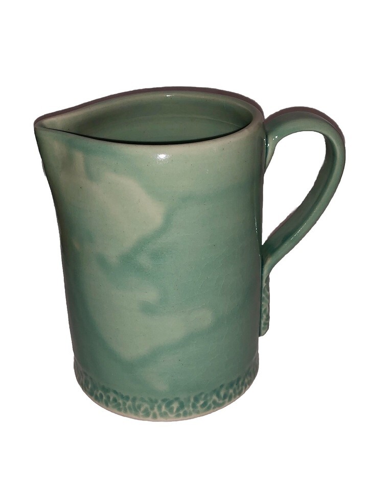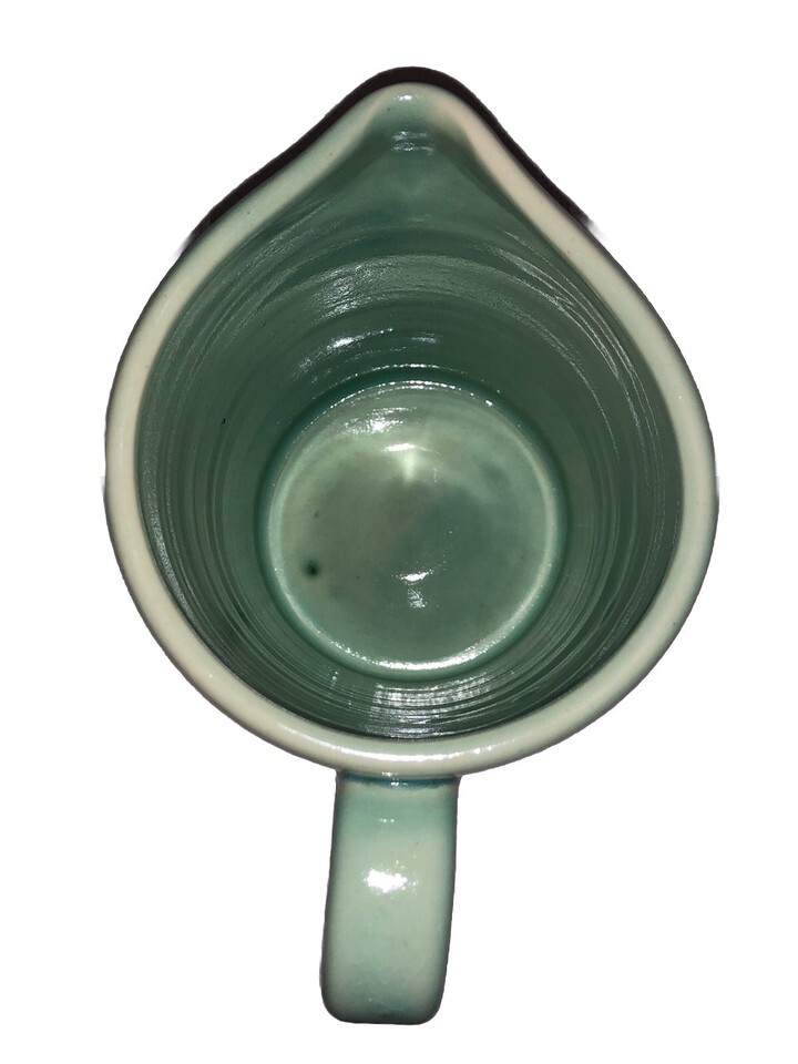 This VTG Studio Art Pottery Pitcher is a hand-thrown stoneware piece by artist Sigmon, featuring a unique Aqua Teal color with a rustic farmhouse style. Standing at 6 inches tall with a 4-inch diameter, this vintage original pitcher is decorated with a handle and has a glossy finish. Handmade with a pottery production technique, this Arts Crafts/Mission Style piece exudes a country charm and is sure to be a standout decorative item in any home. Has grazing. See photos as part of the description.