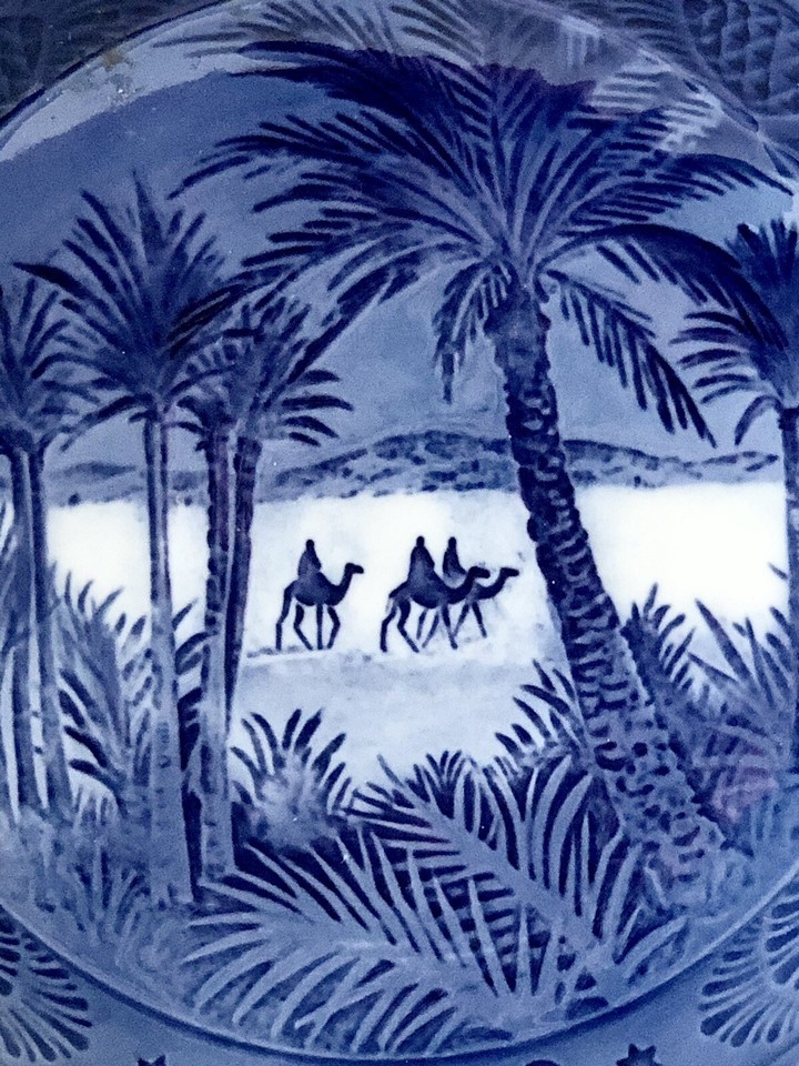 This product is a Royal Copenhagen collector plate from Denmark. It features a blue and white design with a desert motif and depicts three wise men. The plate was produced in the late 20th century using pottery techniques and is made of porcelain. It is vintage and was manufactured in Denmark. 7.25 inches in diameter.