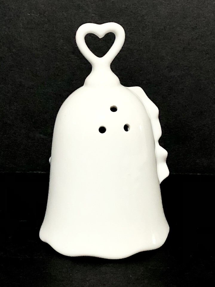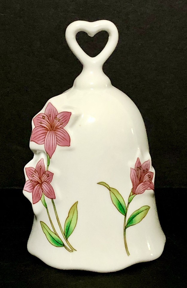 Vintage Bell White Pink 3D Floral Porcelain 5” Heart Handle Green Stem Ceramic