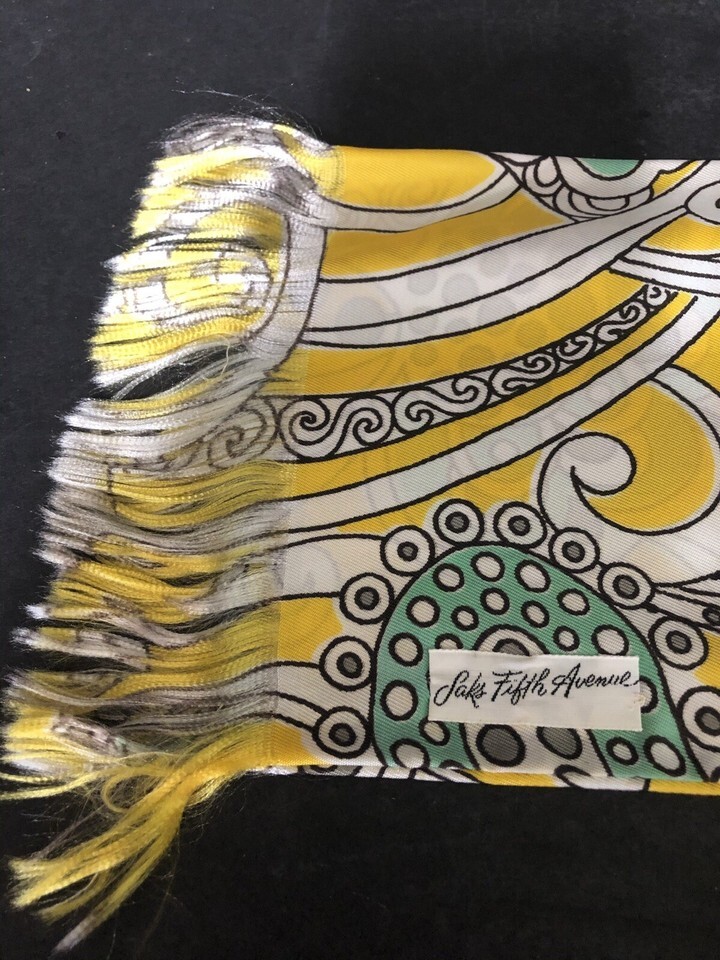 Vintage Saks Fifth Ave Scarf 70” X 5” Yellow Foam Green White Fringed W/ Box