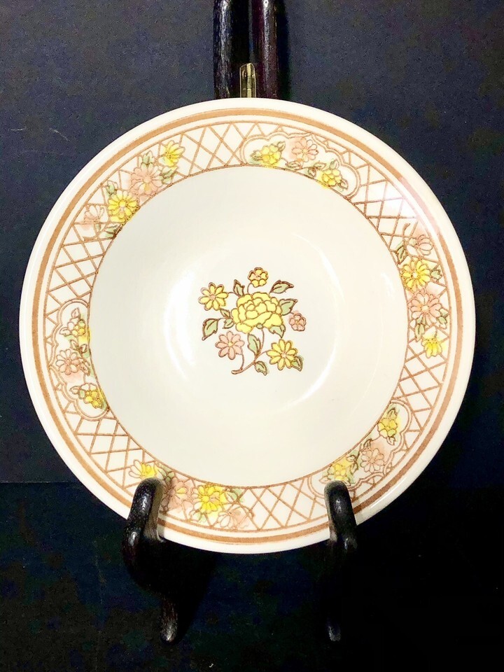 Elevate your dessert and fruit presentations with these exquisite Royal China Americana Tiffany pottery bowls. Featuring a vibrant yellow hue complemented by a delicate floral theme, each bowl is a testament to the timeless charm of vintage art pottery. Made from high-quality stoneware, these pieces are both durable and beautiful, ensuring they're a perfect fit for any occasion.