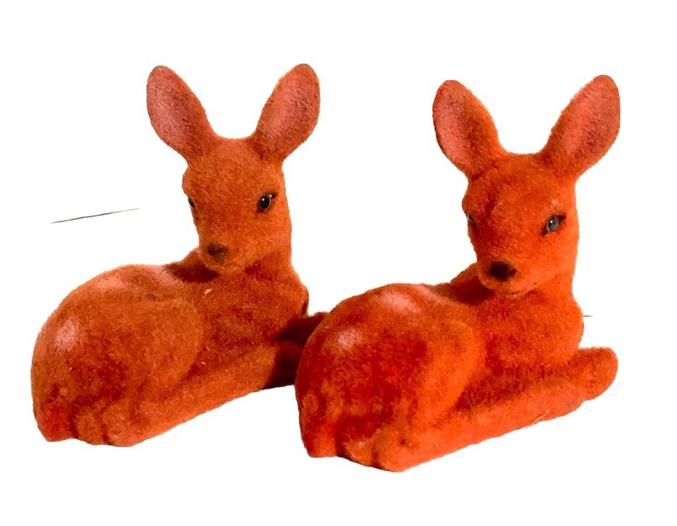 Vintage Set of 2 Fuzzy Flocked Deer Fawn Laying Down 5” Long 4.75” Tall Rust