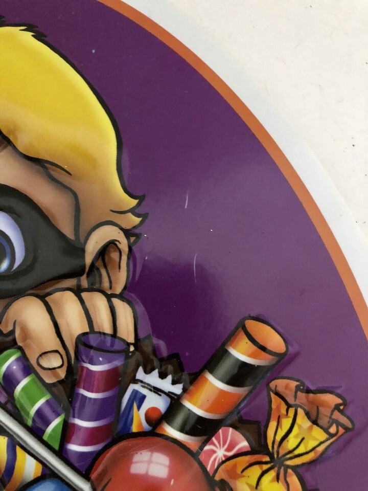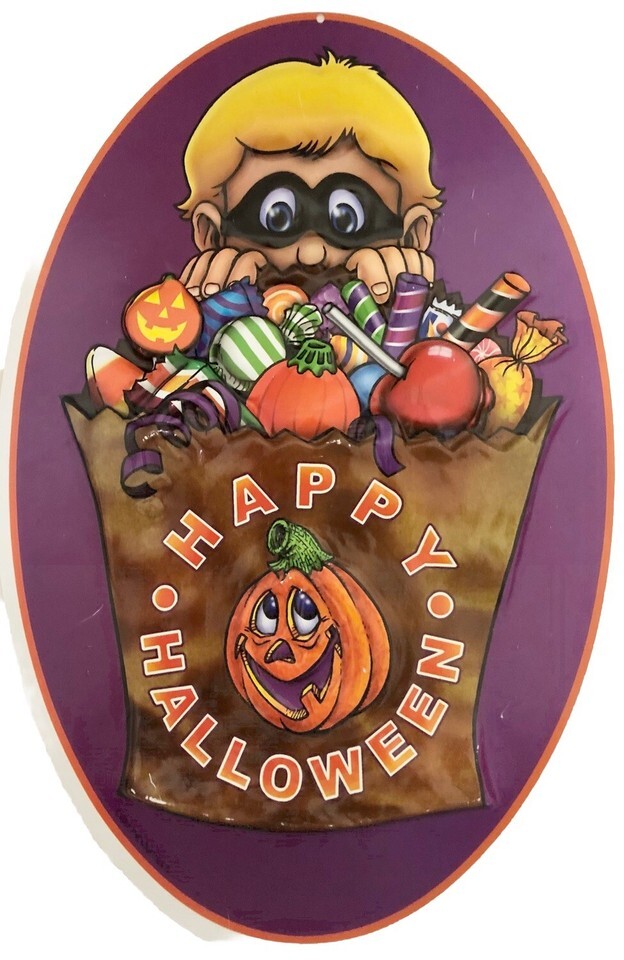 This is a vintage Beistle Halloween decoration featuring an embossed die-cut design of children with a bag of candy. The size is medium, measuring 17 inches in length and 11 inches in width. The multicolor plastic decoration is suitable for wall or door display, with a seasonal Halloween theme and a vintage style.