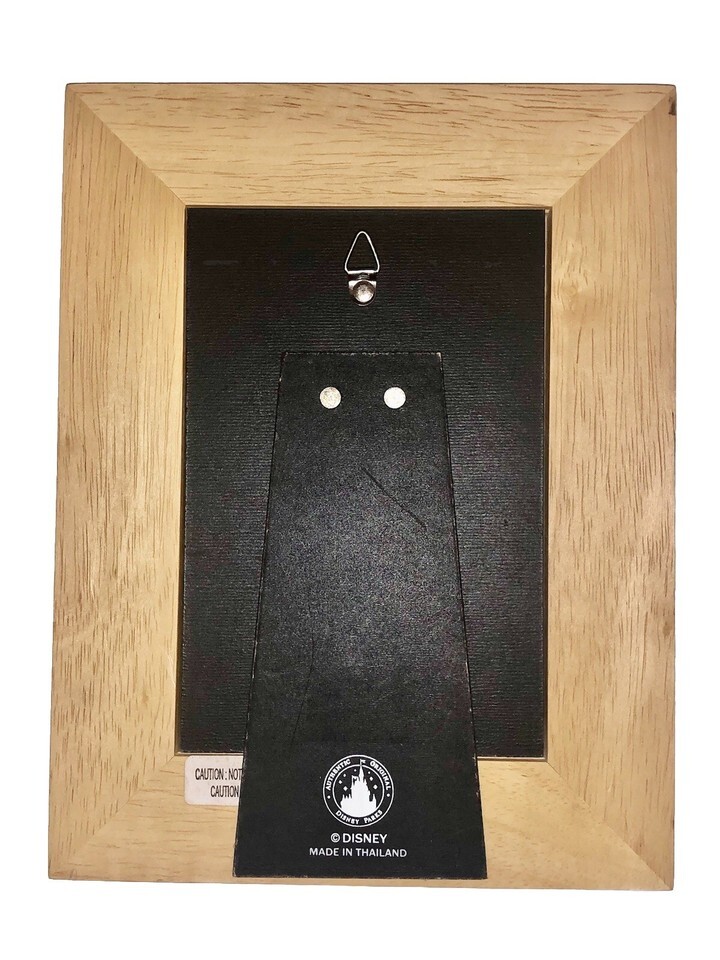 The Vintage Disney Parks Mickey Mouse Wood Picture Frame is a charming collectible featuring a 4" x 6" photo slot perfect for displaying memories from Disney adventures. Made in Thailand. With its nostalgic design and high-quality craftsmanship, this item is a delightful addition to any Disney collection or a special gift for fans of the iconic mouse. Walt Disney World A Magical Memory of a Magical Day.