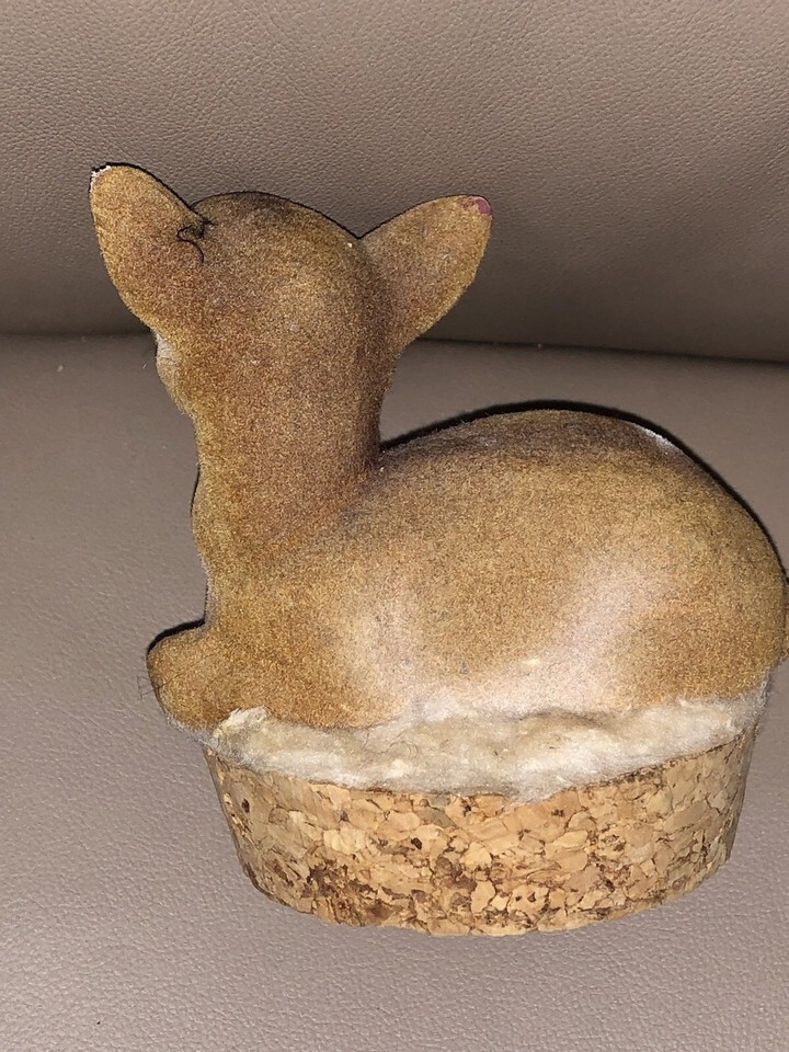 The product is a vintage decorative piece featuring a fuzzy flocked deer fawn laying down on a cork base. Standing at 3.75" tall and 3.5" long, this brown-colored figurine is a charming addition for collectors of farm and countryside-themed items.
