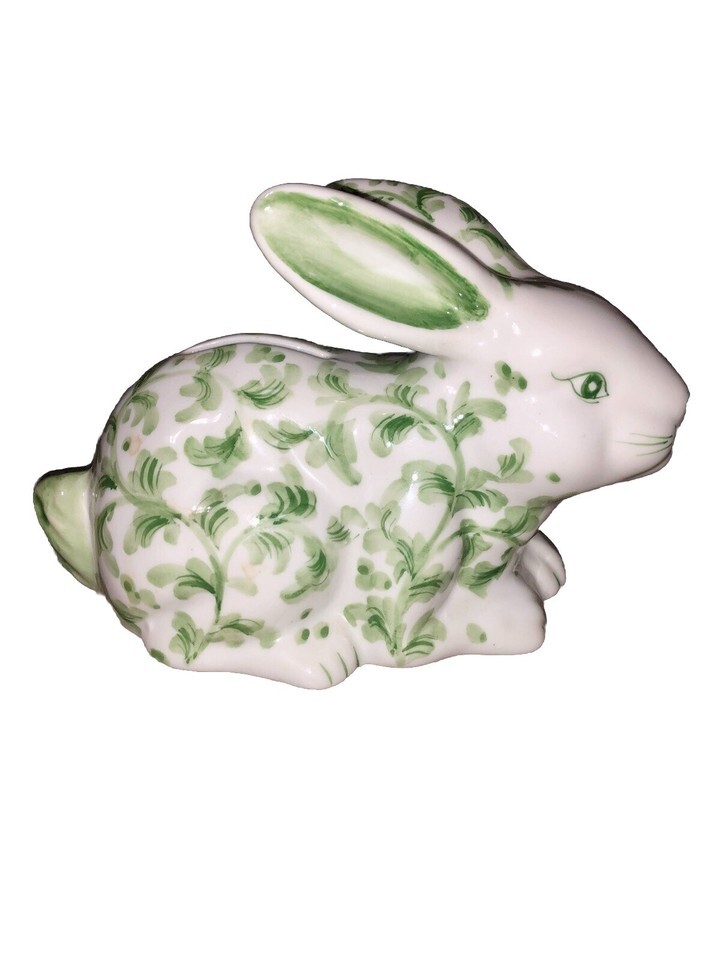 This vintage Andrea By Sadek Easter Bunny Rabbit Coin Piggy Bank is a charming addition to any collection. The ceramic bank features a green floral design and stands at 4 inches tall and 6 inches long. It's perfect for storing coins and would make a great gift for any rabbit lover. The bank is made of high-quality porcelain made in Thailand.