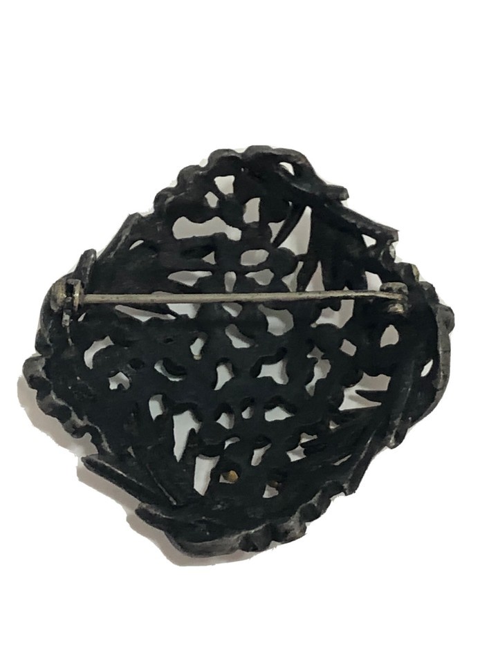 This is a vintage dark bronze tone square brooch with faux blue green rhinestones. It measures 1 3/4" in length and features a gold base metal. This brooch falls under the Women's Fine Jewelry Department and has a classic vintage design, making it a stylish accessory for any occasion.