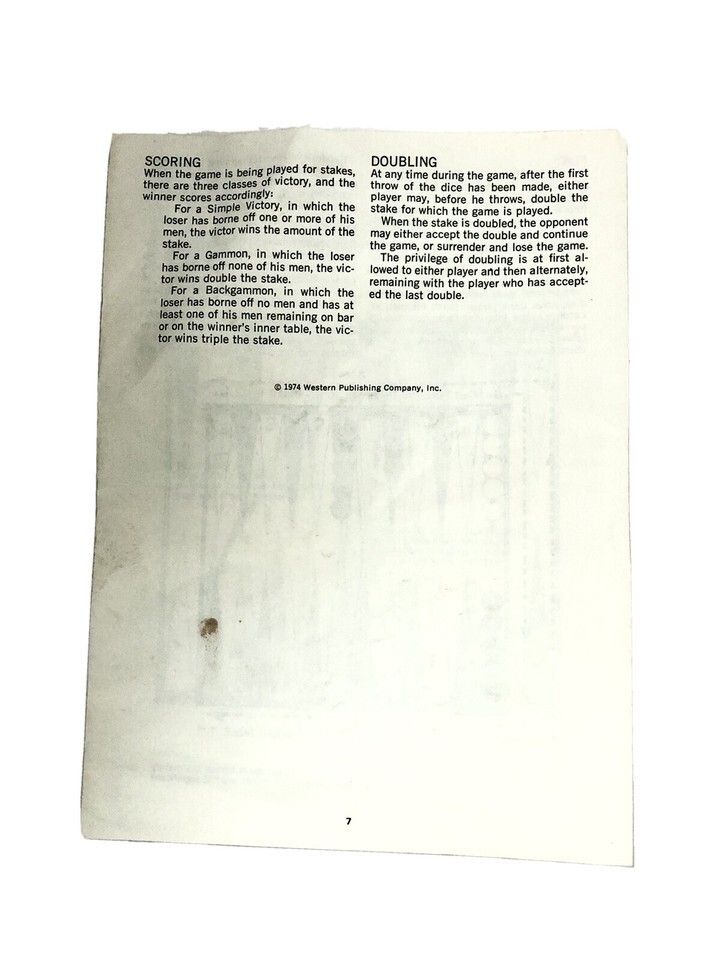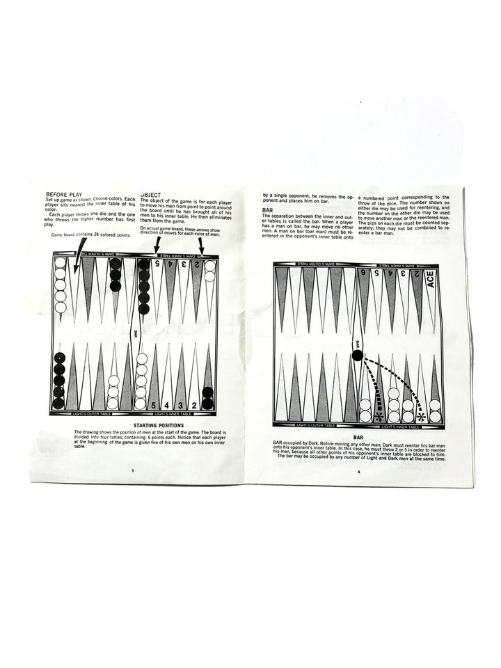 Experience the classic fun of Backgammon with this vintage 1981 Whitman game. Perfect for boys and girls, it comes with everything needed to play, including the original box and instructions. This game is recommended for ages 7 and up and can be played by a minimum of 2 players.