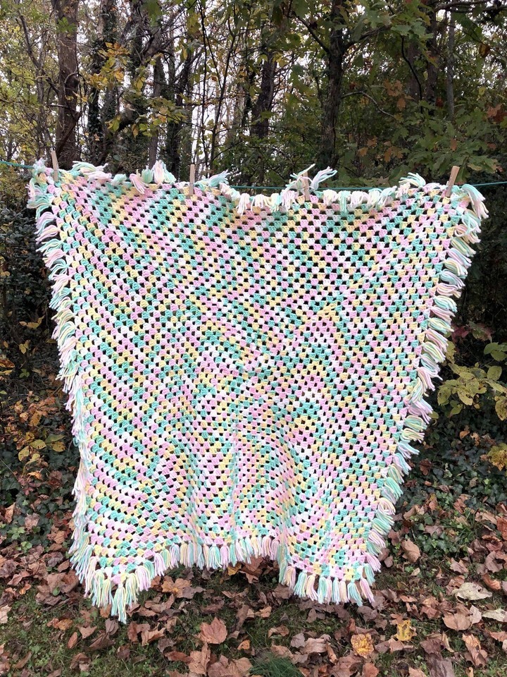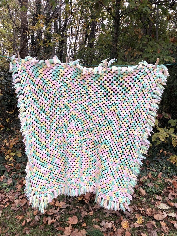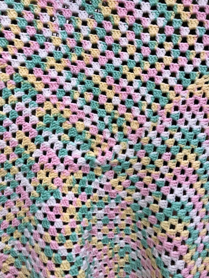 This Pastel Green White Pink Teal Crochet Baby Afghan Blanket Throw is a handmade, multicolor crib blanket measuring 36?x 36? with fringe. It is a unisex baby blanket made with crochet/knit material, featuring a vibrant and colorful design. Perfect for keeping your little one warm and cozy in their crib, this stylish and functional blanket is sure to be a cozy addition to any nursery bedding collection.