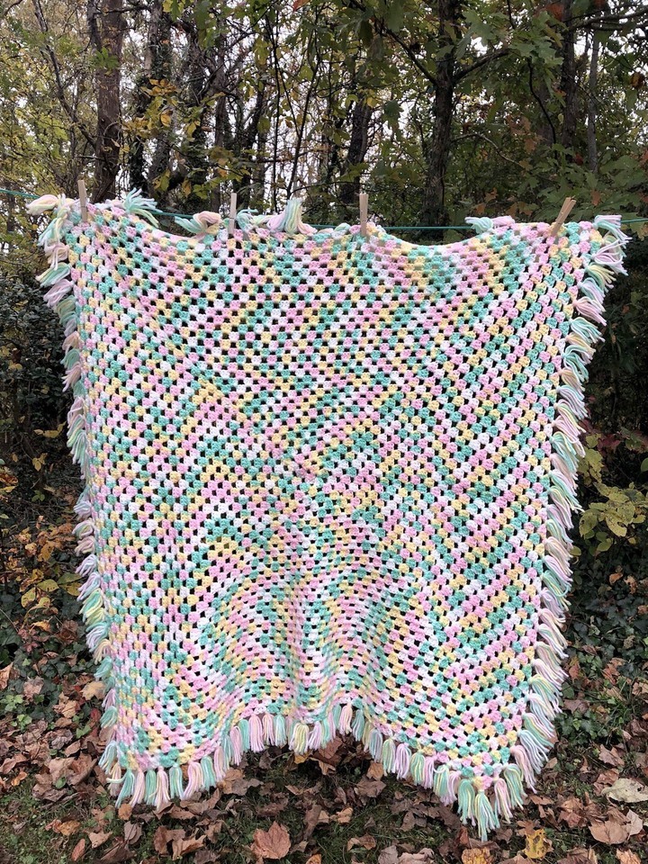 Pastel Green White Pink Teal Crochet Baby Afghan Blanket Throw 36”x36” Fringe
