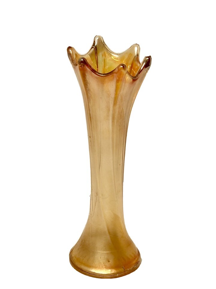 Vintage Lot of 2 Iridescent Marigold Carnival Glass Ribbed Ruffle Fluted Vase Splash Drop Rim 8.5?.
