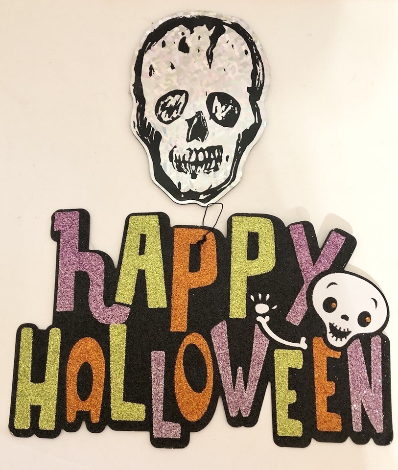 Celebrate the spooky season with these vintage Halloween decorations. These cardboard hanging signs feature a skull pattern and read "Happy Halloween". They are perfect for adding a touch of seasonal decor to your home. The signs can be hung on a wall, window, or door and are suitable for teens, adults, and kids alike.