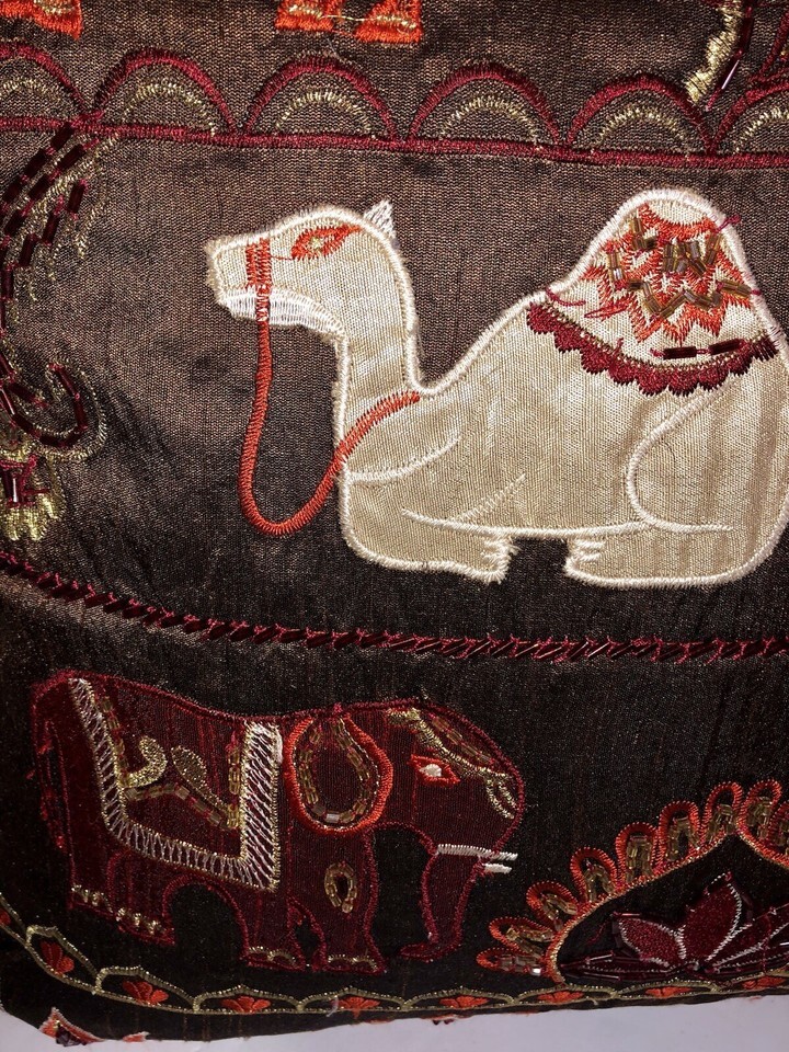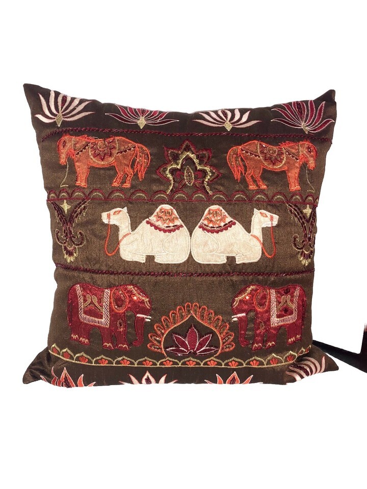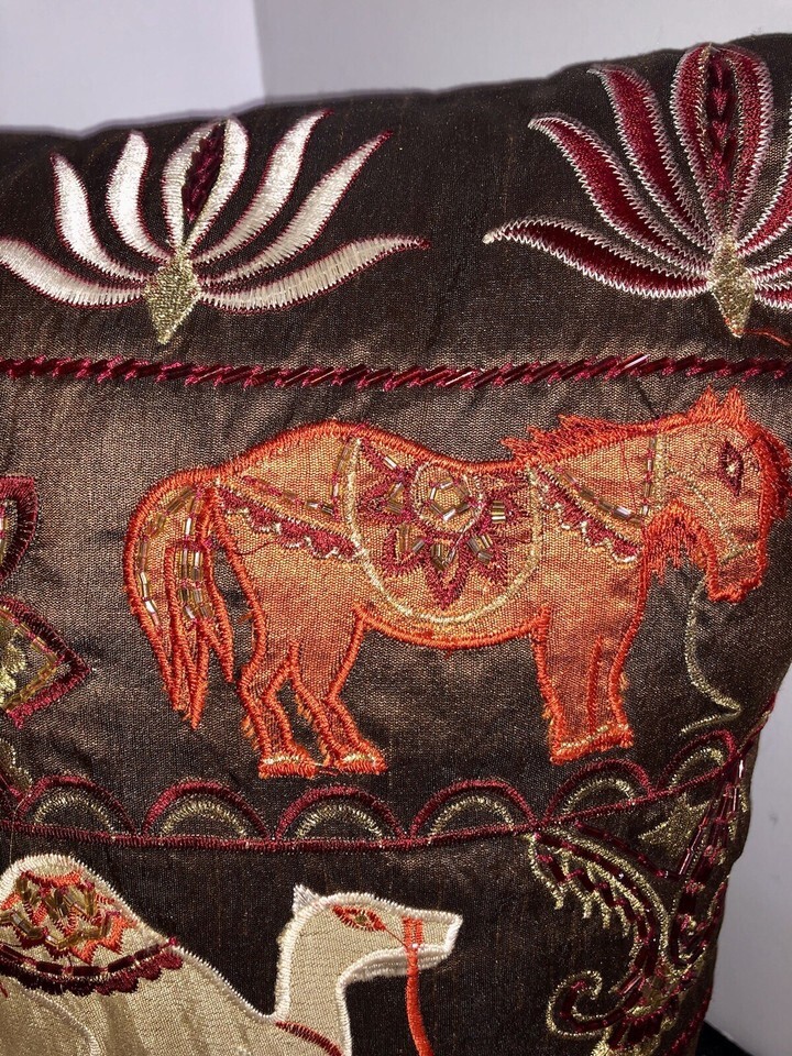 Pier 1 Throw Pillow Beaded Sequined Brown Bronze Rust India Camel Elephant Horse