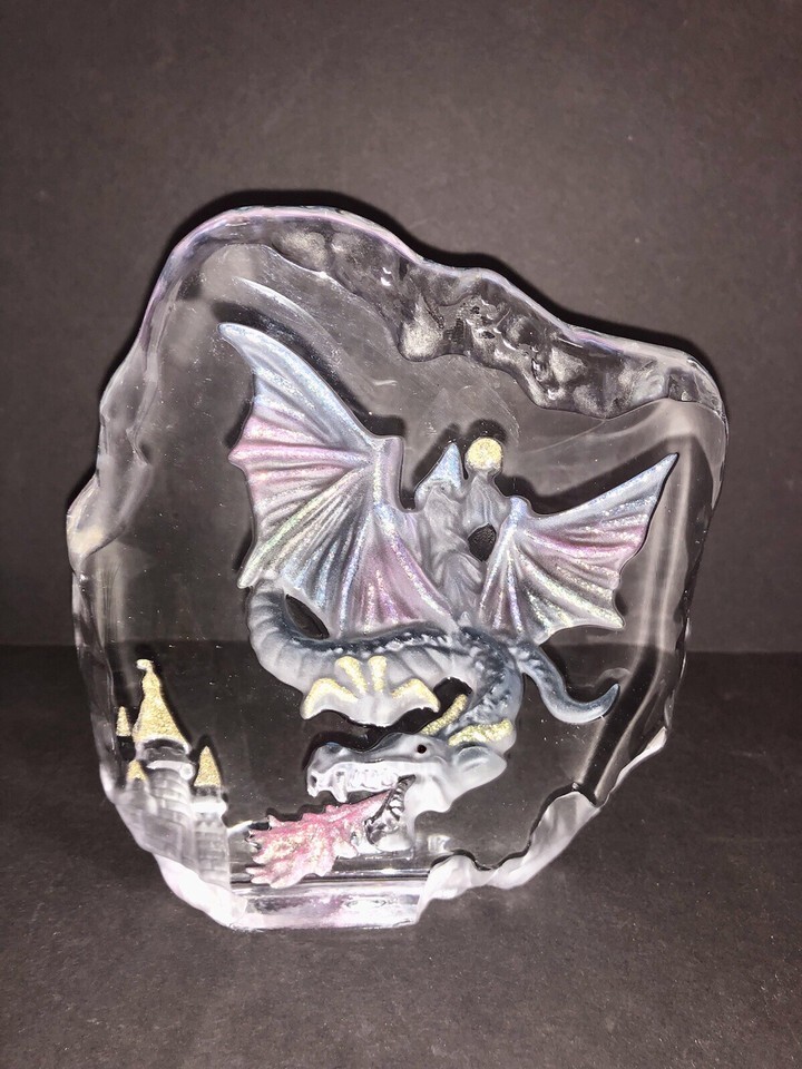 This beautiful paperweight features a Wizard riding a majestic dragon with a glittering crystal and multicolored glass design. The intricate etching and art glass production style make it a unique and eye-catching piece, perfect for any collector or lover of dragons.