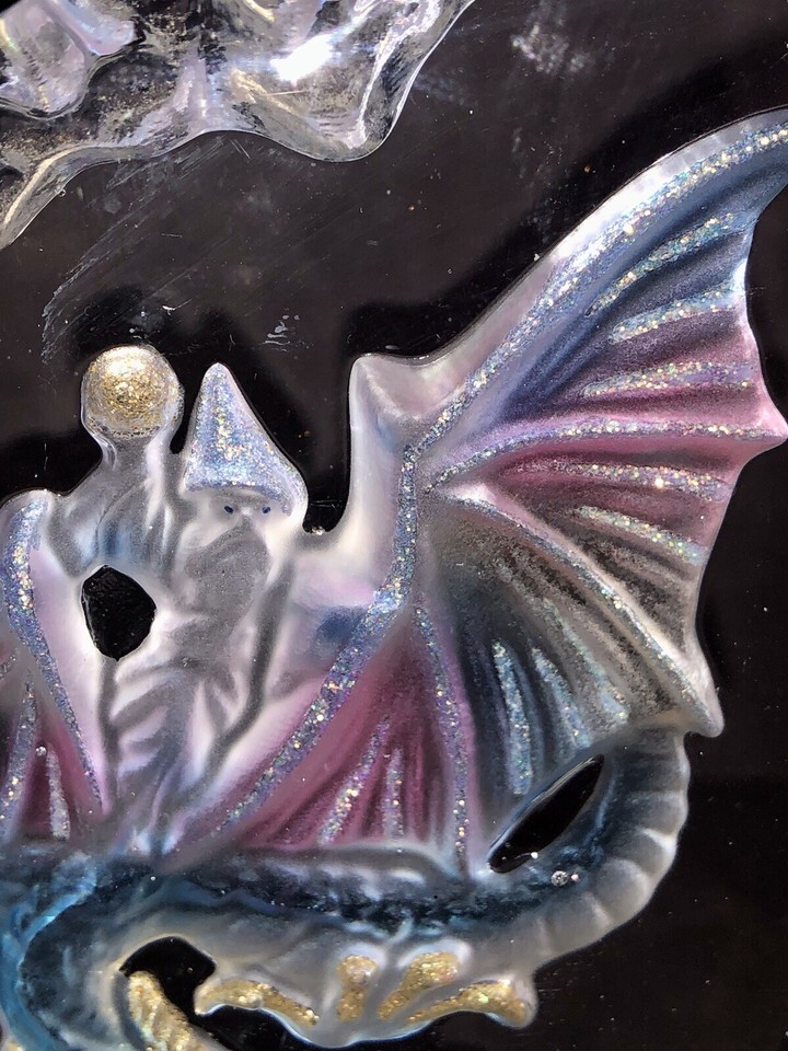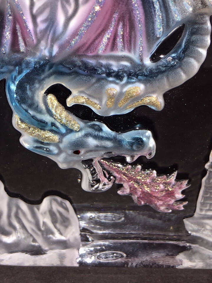 WIZARD Rides DRAGON Castle GLITTER Etch CRYSTAL Glass PAPERWEIGHT Blue PINK Gold