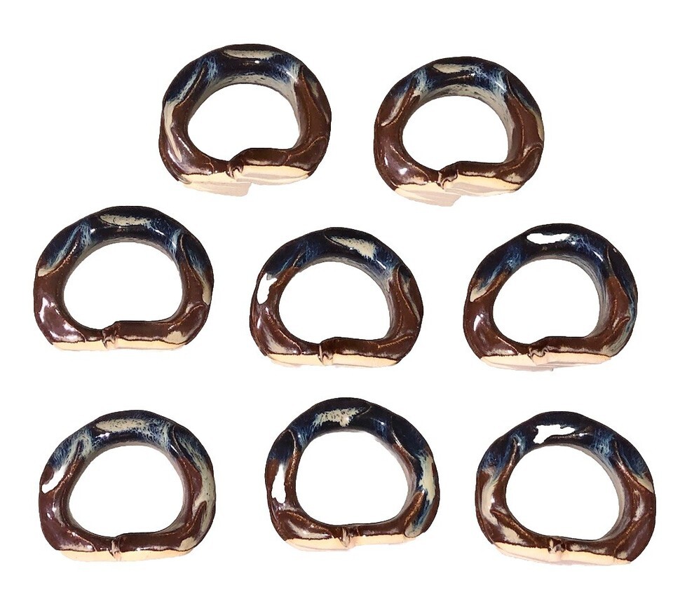 Set Of 8 Vintage Handmade Pottery Napkin Rings Blue Glazed Beautiful!!