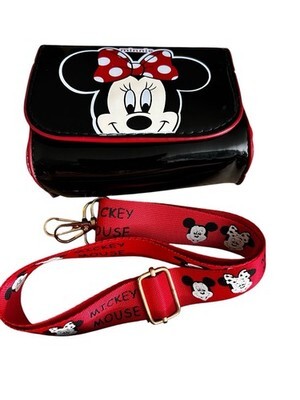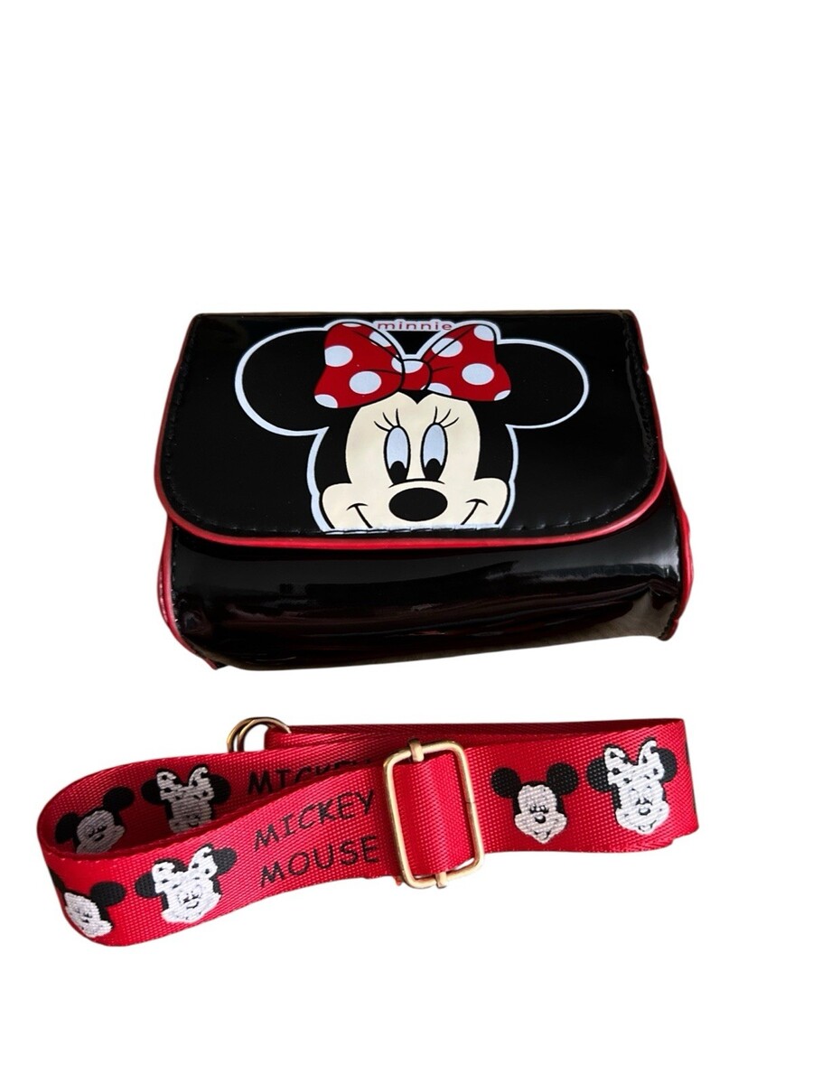 Add a touch of Disney magic to your outfit with this adorable Minnie Mouse mini crossbody bag. Made of shiny black patent leather with a bold red trim and Minnie?s iconic face and polka-dot bow on the front. Perfect for kids, theme park days, or Disney collectors!