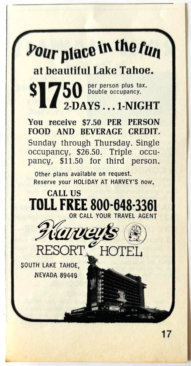 1972 Harvey's Resort Hotel Advertisement Lake Tahoe Nevada Vintage F6J