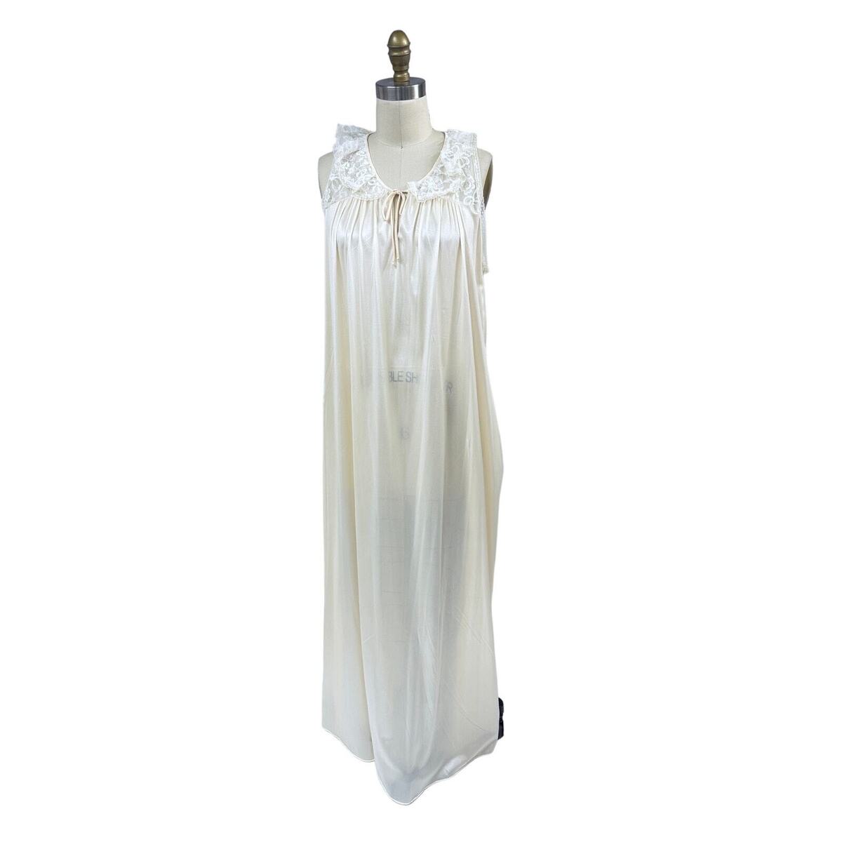 Introducing a beautiful VTG 60s Odette Barsa cream 100% nylon nightgown, complete with lovely lace trim and collar, in size large. It?s in like-new, unworn condition! Here are the approximate measurements when laid flat for your convenience: