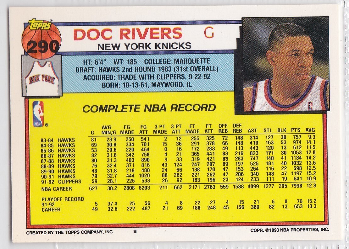 M) 1992-93 Topps Basketball Trading Card - Doc Rivers #290