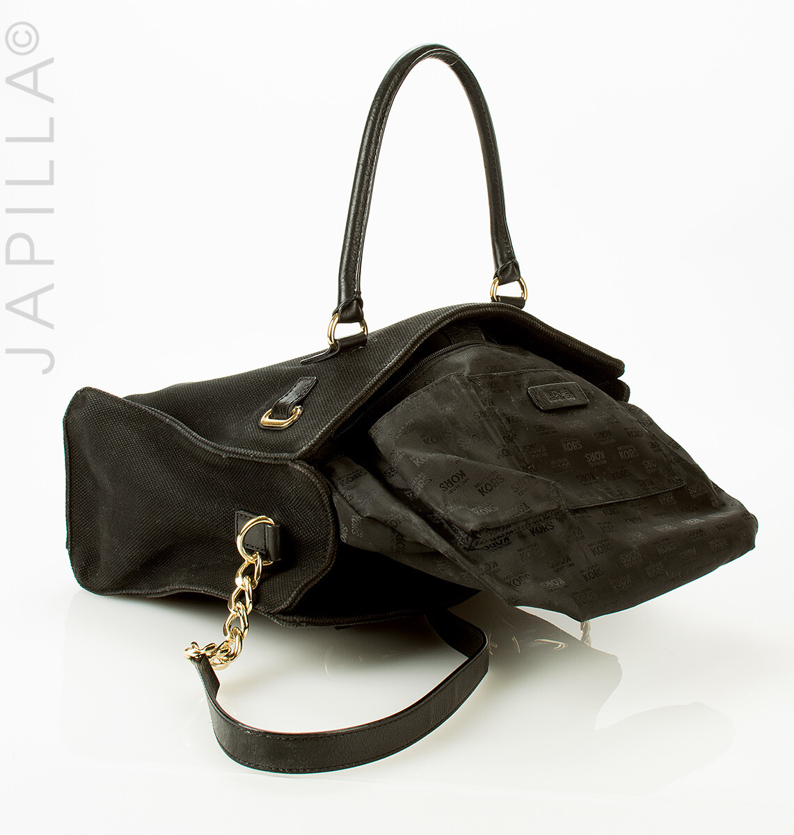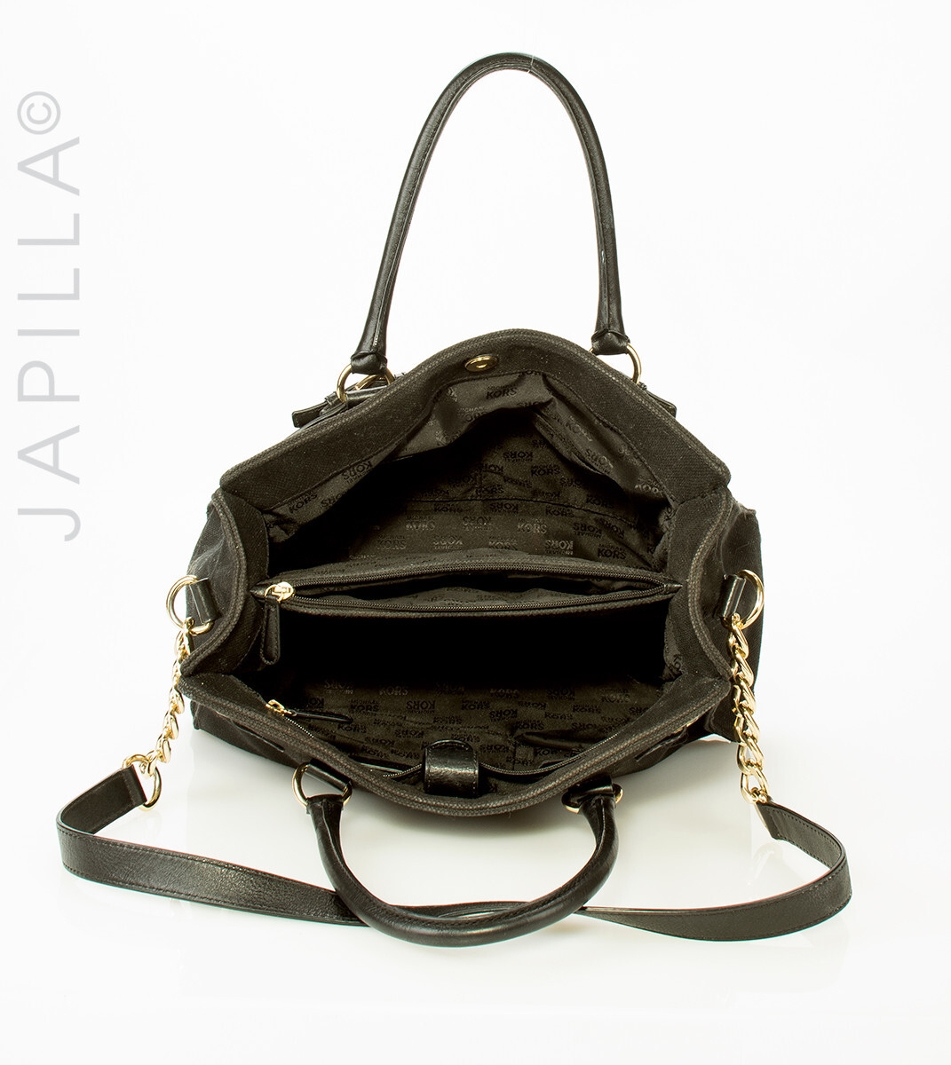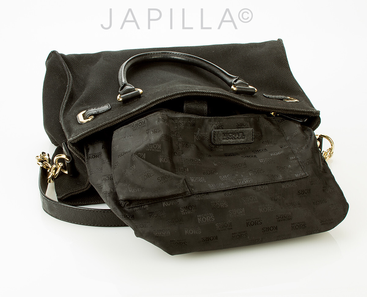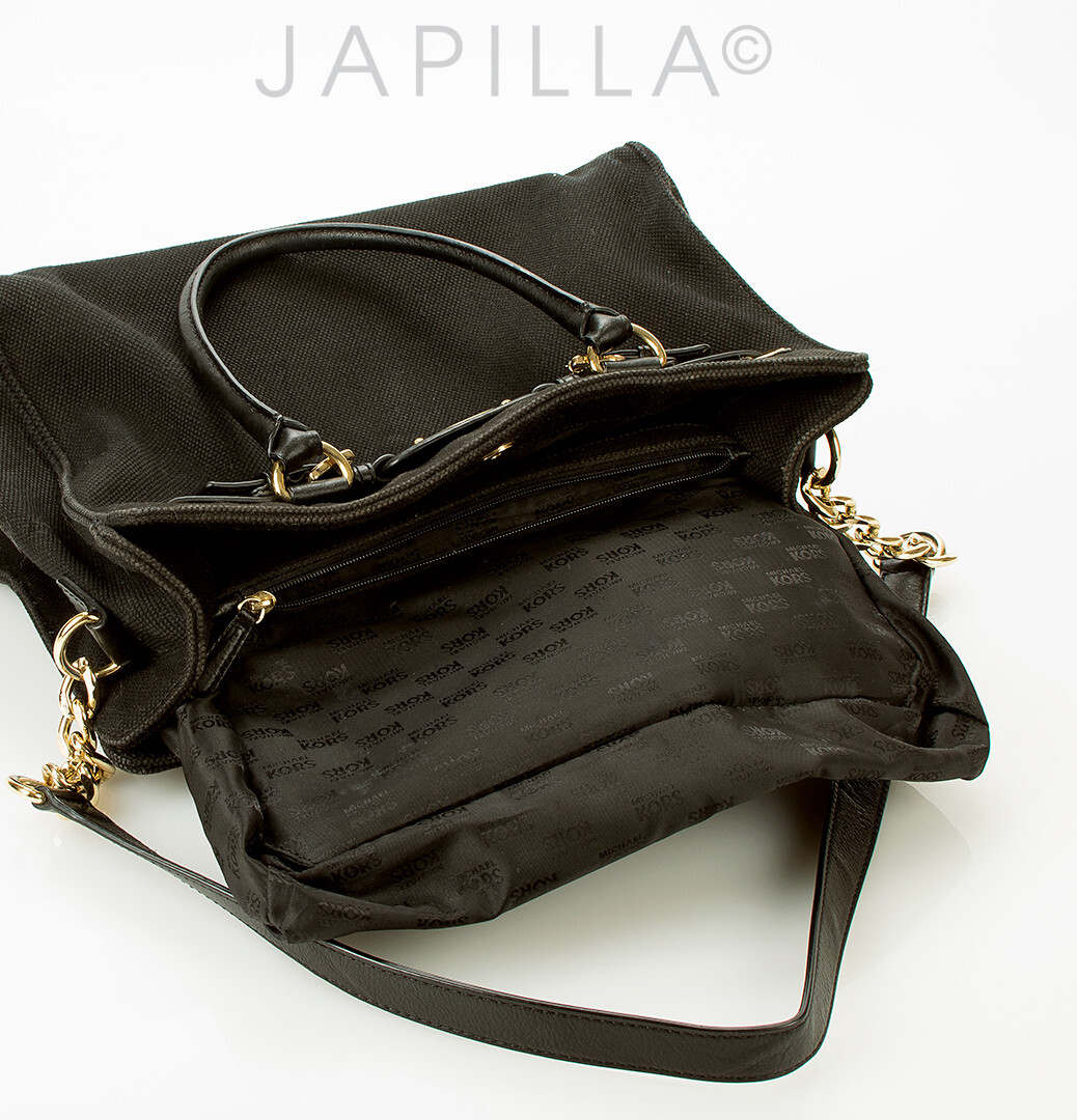 Inside is your typical MK lining made of black sateen MK logos. Triple compartment, which middle one is zippered and the other two close magnetically.
