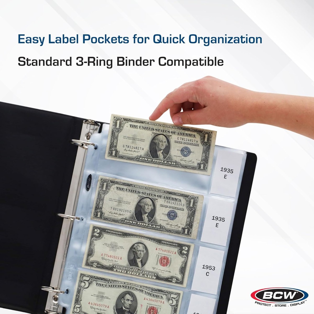 The BCW Pro 4-Pocket Currency page is an acid free, archival quality product that is perfect for storing 2 " x 6 " modern US currency. The page features a 1 oe" x 2 " label pocket to the right of the currency pocket. This product is high clarity and top loading pockets with strong welds. BCW Pro 4-Pocket pages fit all BCW 3-ring binders and albums.