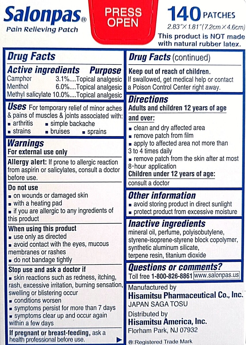 Salonpas 140 Pain Relieving Patches External Arthritis Back Relief EXP 11/2026