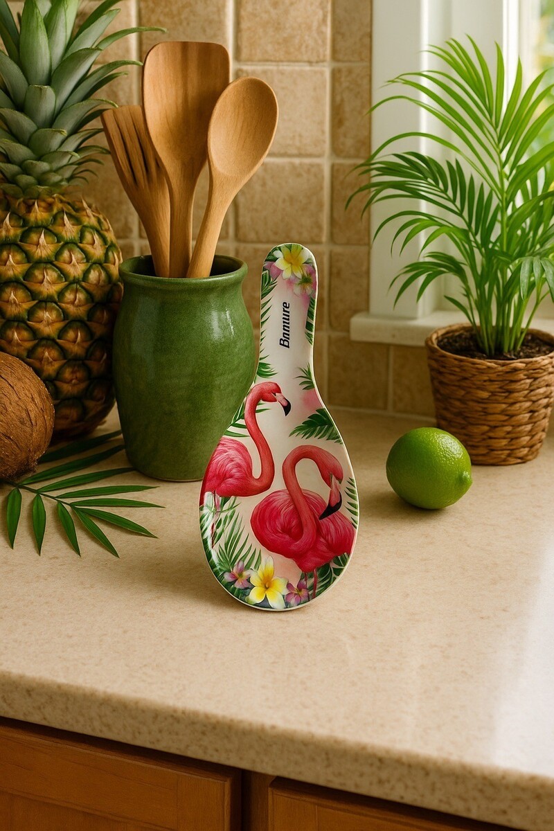 Bonaire Souvenir Ceramic Spoon Rest – Pink Flamingos Tropical Flowers – @giftcor