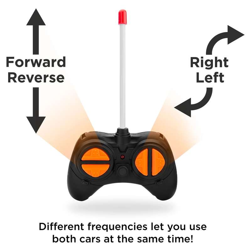 Get ready for a historic racing experience with double-trouble bumper cars! These tiny terrors have a top speed of 9 miles per hour for accurate handling and smooth turning. Designed with treaded rubber tires, front and rear bumpers, and detailed texture for an exciting experience. Different frequencies let play with use both cars at the same time; use your left hand to move your bumpers forwards and backwards and your right hand to steer left or right. Dino bumpers are 7.6cm (L) x 8.8cm (W) x 13.3cm (H), each with a 9.5cm (L) x 3.1cm (W) x 25.4cm (H) remote control.
