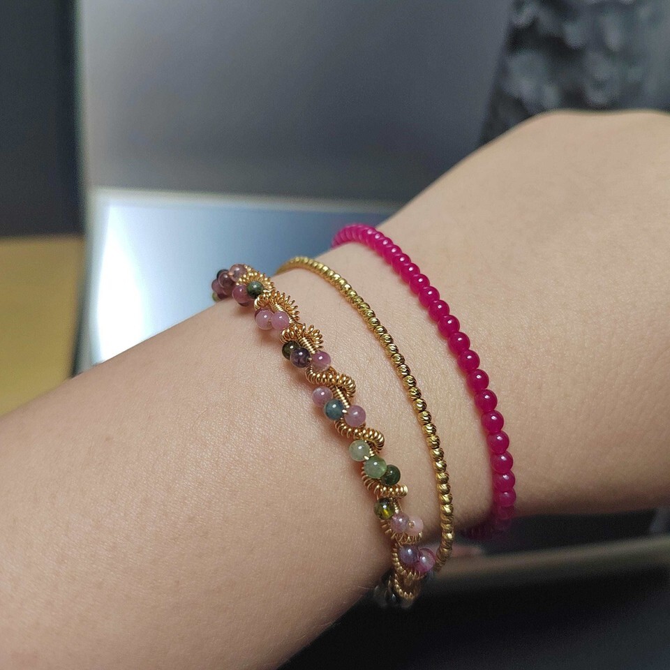 Add a touch of luxury and meaningful beauty to your collection with this handcrafted tourmaline bangle—featuring vibrant natural beads in pink, green, and black tones. Woven into a twisted 14K gold-plated frame, this piece blends healing energy with timeless sophistication, perfect for gifting or personal wear.