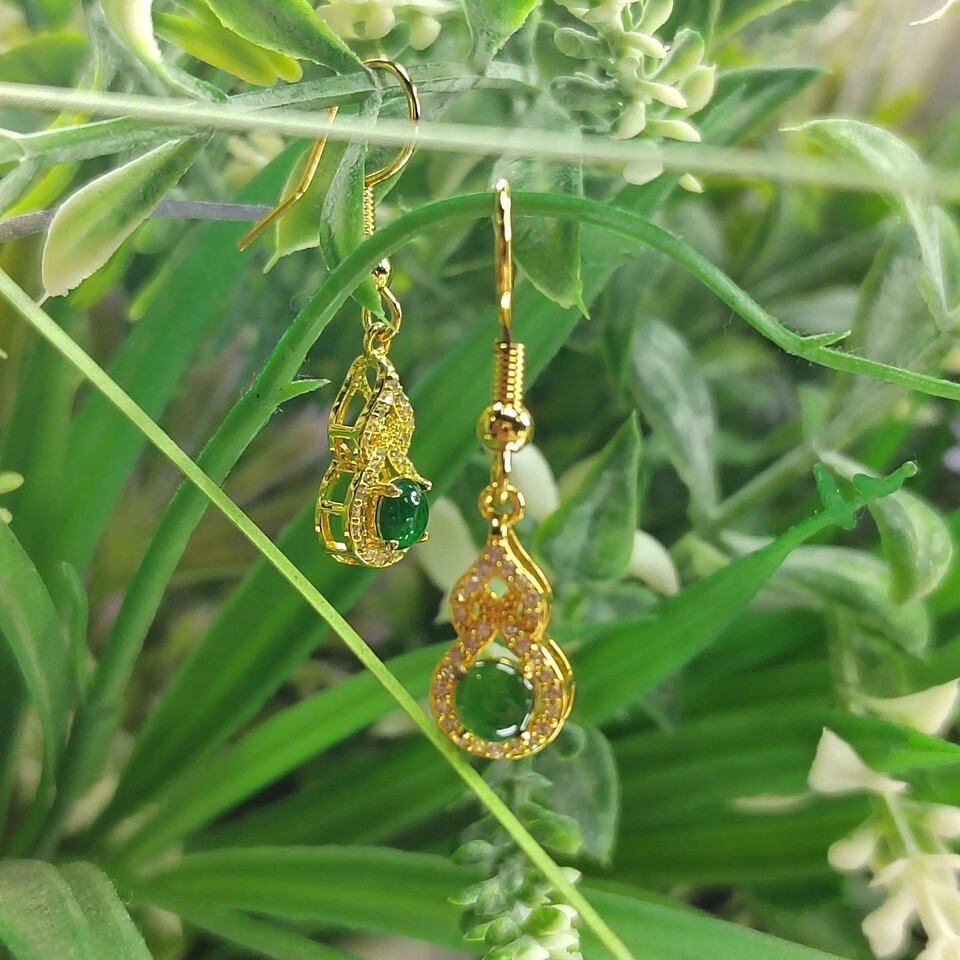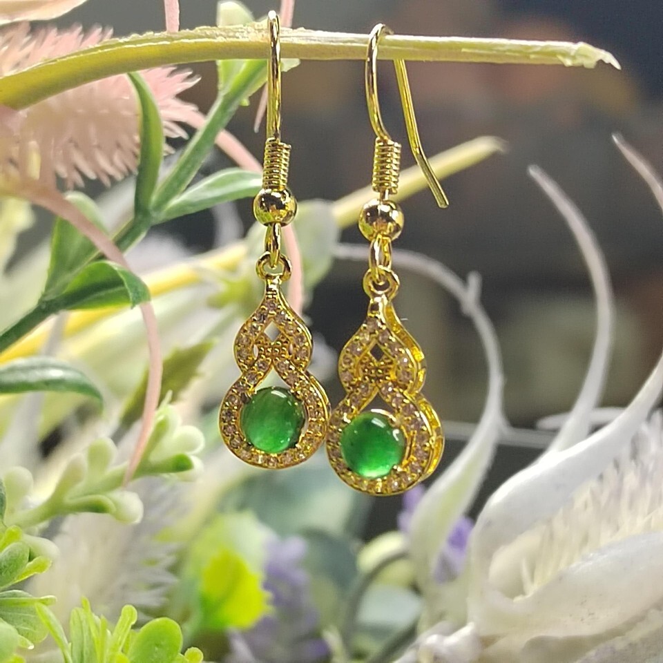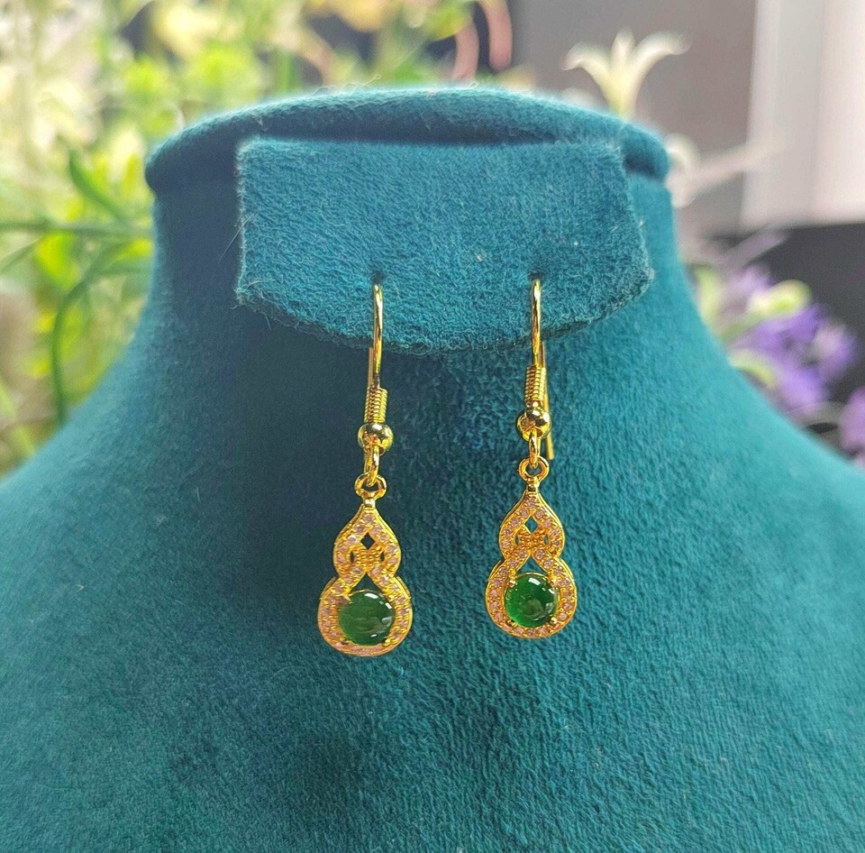Elevate your style with these exquisite Imperial Green Jadeite dangle earrings, crafted from natural untreated jadeite and accented with shimmering zirconia. Set in 925 sterling silver plated with yellow gold, they blend traditional symbolism with modern elegance—making them a radiant addition to any jewelry collection.