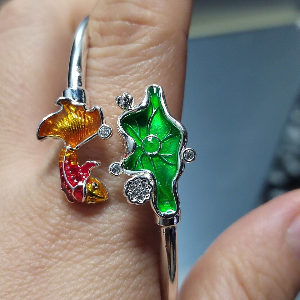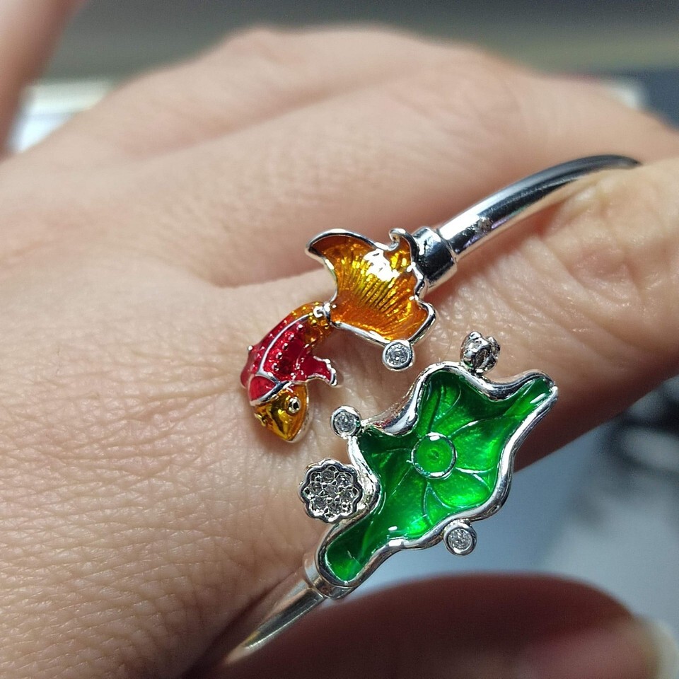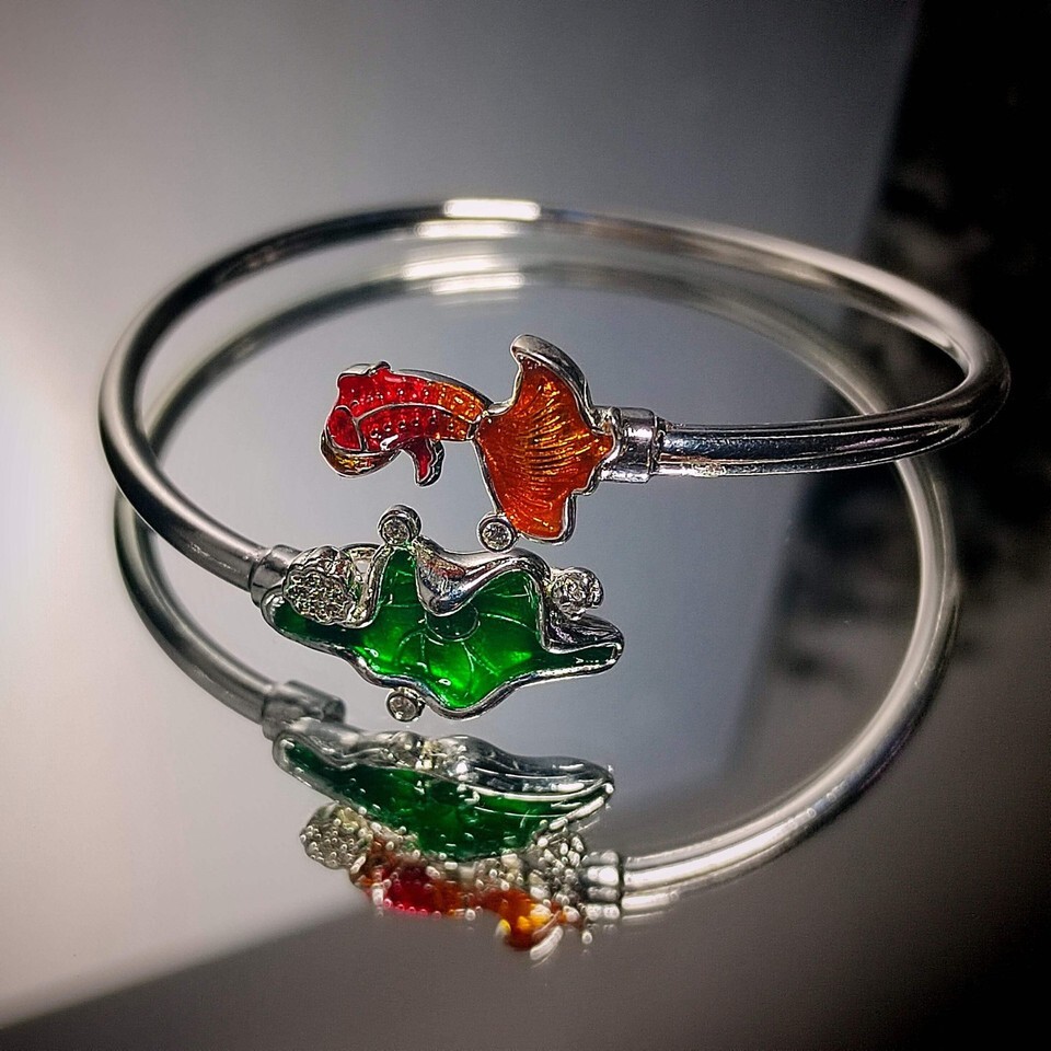 This handcrafted bracelet carries deep cultural meaning. It features two powerful symbols in Asian tradition: the lotus leaf, representing purity and resilience, and the fortune goldfish, a timeless emblem of prosperity and abundance. A sparkling zircon accent adds subtle brilliance and spiritual depth.