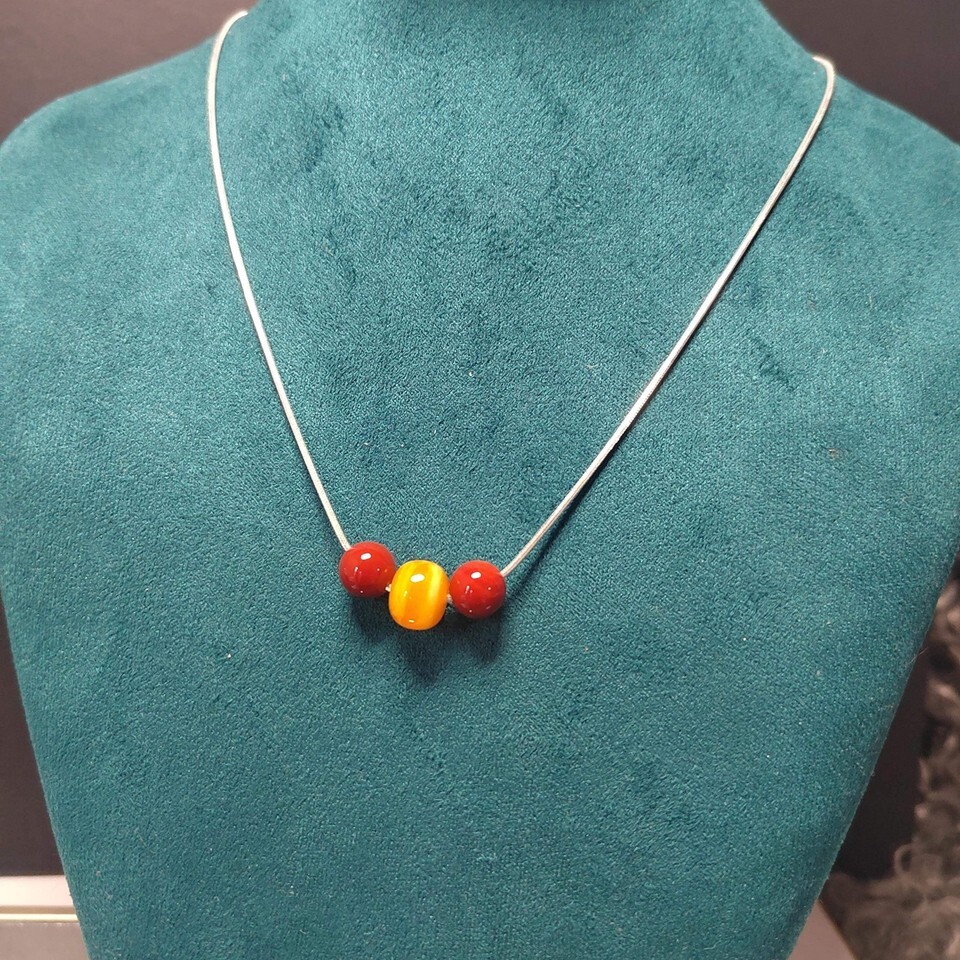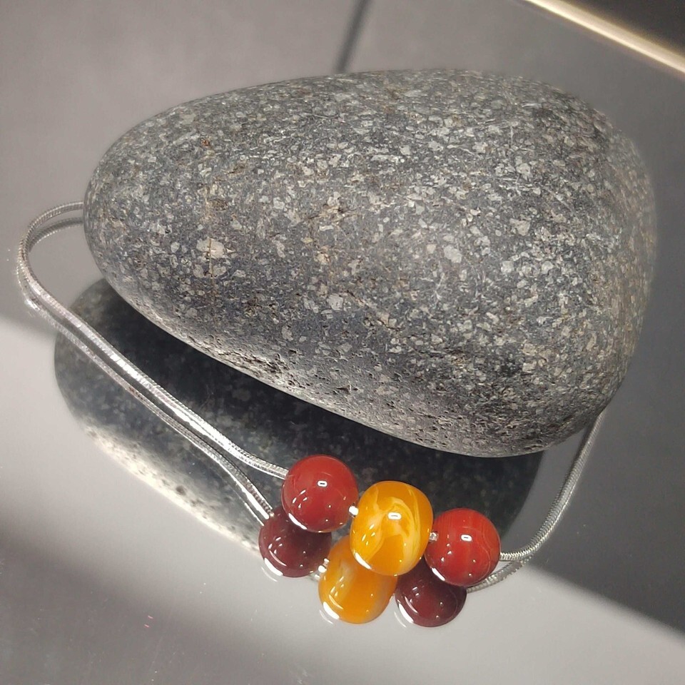 Bracelet: Two 8.3 mm Nanhong agate beads and one 9.3 mm amber bead on 45 cm adjustable chain