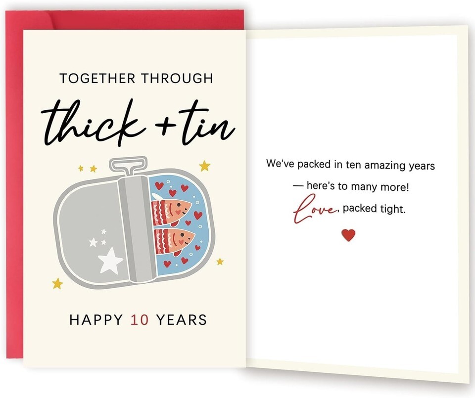 Perfect 10 Anniversary Card ? Celebrate a decade together with a unique ?Thick + Tin? sardine design, a playful twist on ?through thick and thin.?