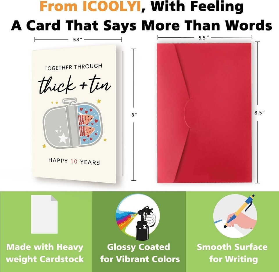 Marking a 10- milestone in your relationship deserves something special. This anniversary card not only expresses your love through its heartfelt message but also captures the humor and joy shared during your decade together.