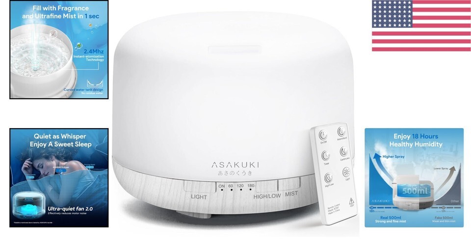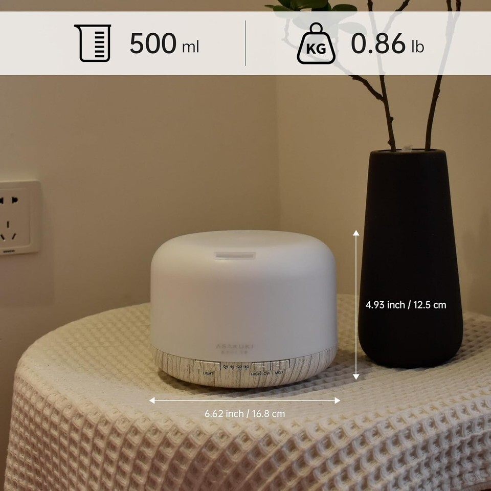 Large Capacity: Features a sizable 500ml water tank that is easy to clean, ensuring long-lasting mist and fragrance.