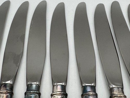 These dinner knives measure 9 1/2" in length and are in very good estate condition with no excessive wear. They are ready to be used with a polish.