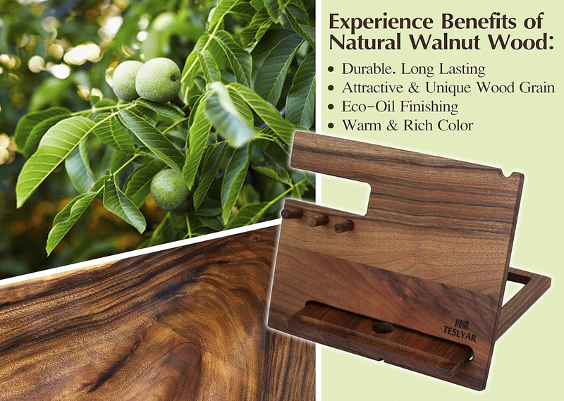 SOLID WALNUT WOOD. This wood docking station is eco - friendly and natural. Walnut is an out-of-competition beacause of the beauty and structure of the wood. This walnut docking station perfectly fits into any interior - both classical and modern styles. Please note: Walnut has a very beautiful and unique coloring - from light brown to dark brown, therefore, the item you bought may be slightly different from the samples on the photo