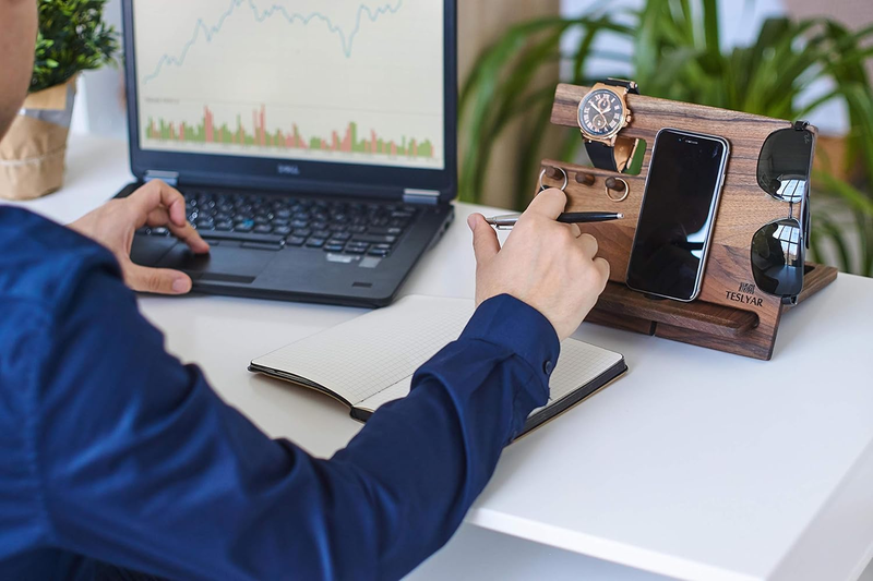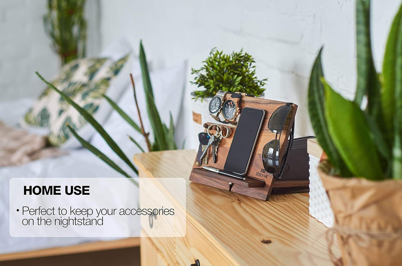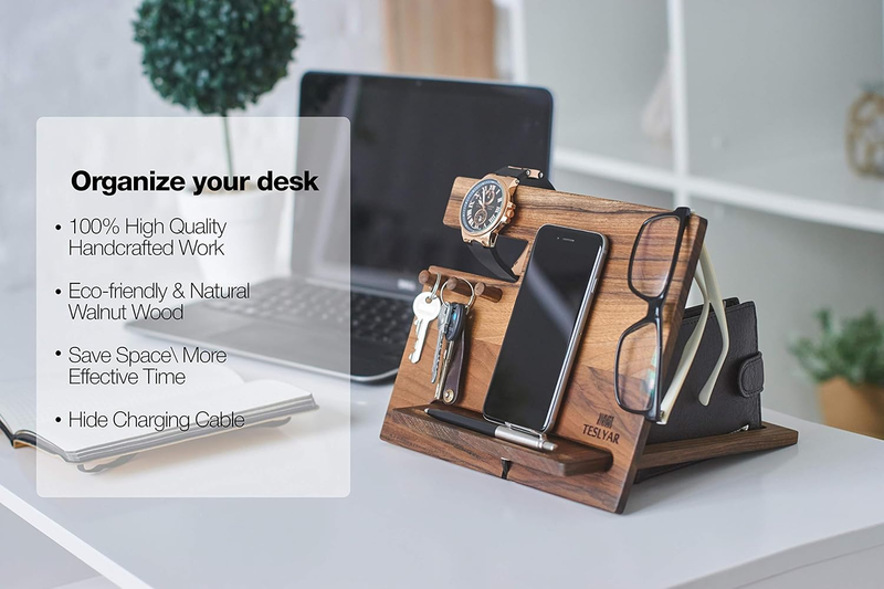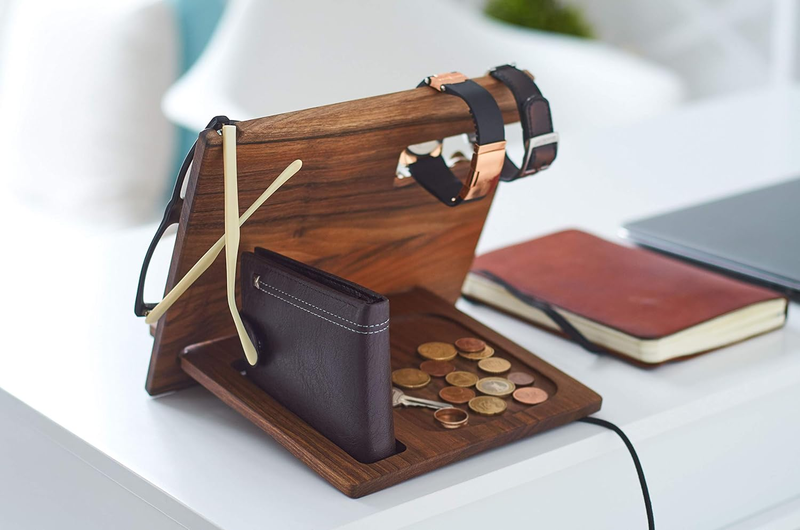 Don't waste your time on looking for all necessary things, with this wood docking station they will be always at the right place. This stand is easy to assemble and disassemble, has a convenient cable cutout that prevents the cable from overly bending. Can be used the same way as a tablet stand for long-time video watching or other information on the screen. Very comfortable and beautiful thing! A perfect gift for your family and friends!