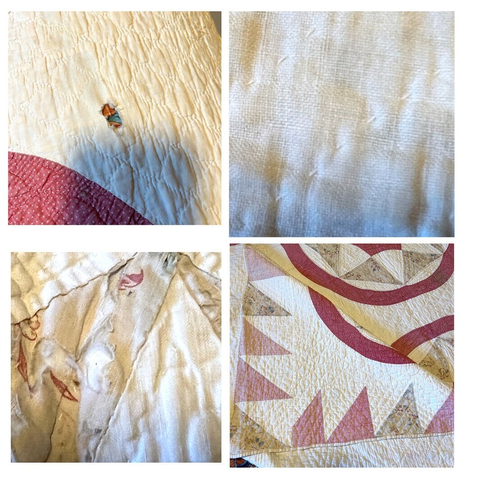 Discover this charming vintage antique hand-sewn shabby feed sack quilt from the 1920s-30s, featuring delightful pinks and whites from the Depression era! This lovely primitive quilt is made from authentic feed sack material and measures a generous 98" x 100". Overall, it's in good condition, lovingly preserved from a Pennsylvania estate, with just a few small holes noticed in some of the appliques. Feel free to check out the photos for a closer look!