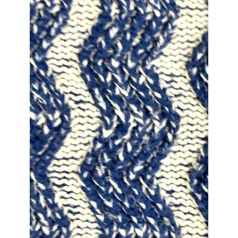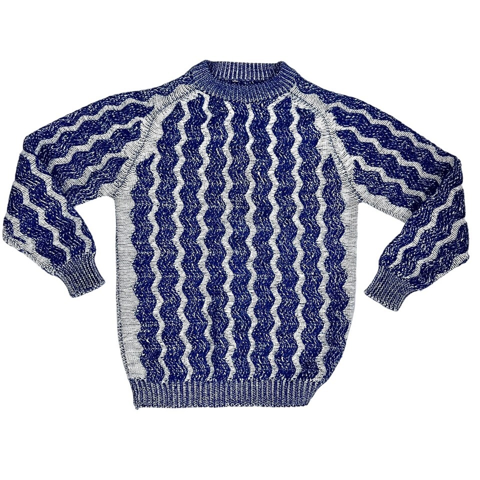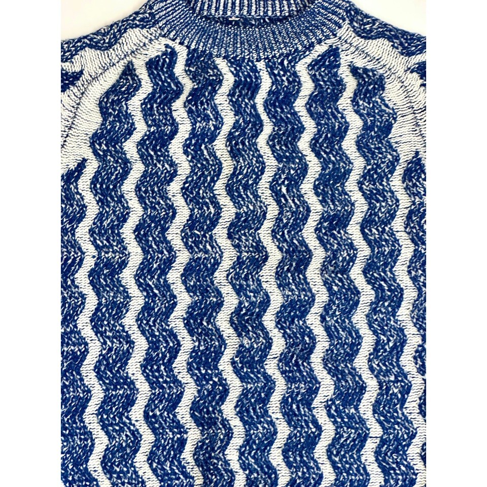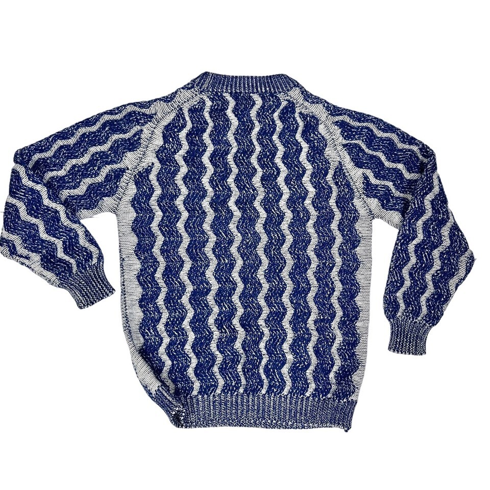 Mens VTG 1970s Blue White Intarsia Acrylic Sweater Squiggly Stripe Coogi Style L