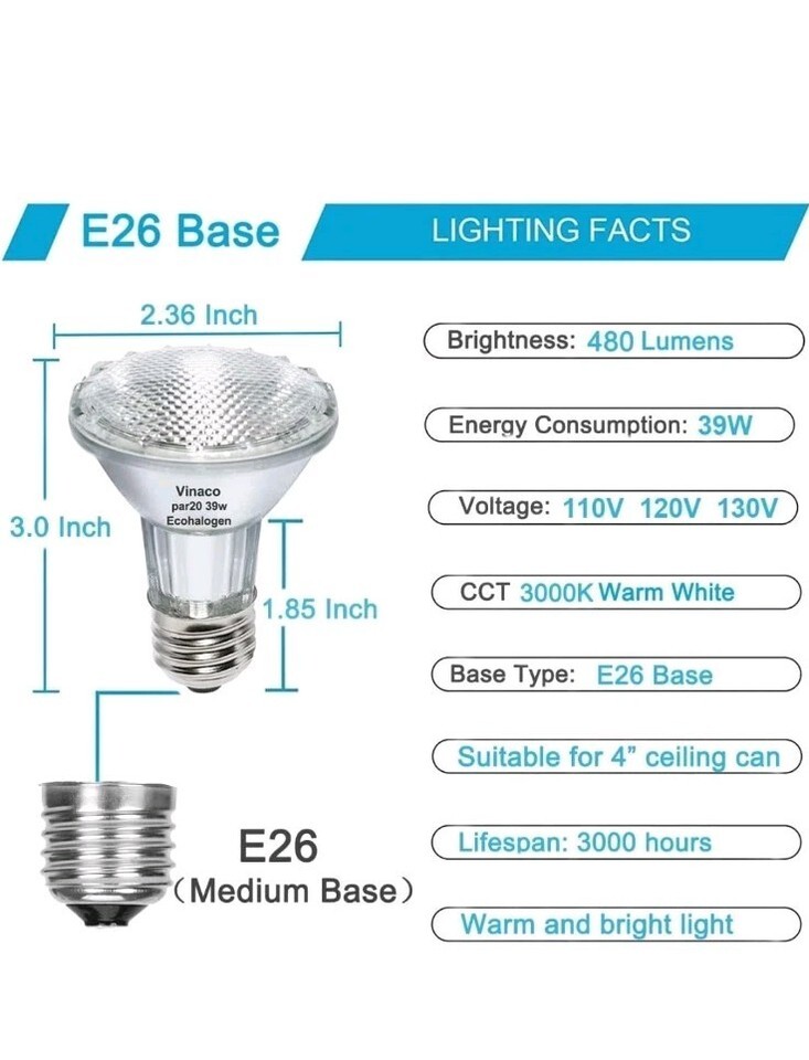 2pcs Vinaco Par20 Light Bulbs, 2PCS Par20 Flood 39W 120V 480 Lumens