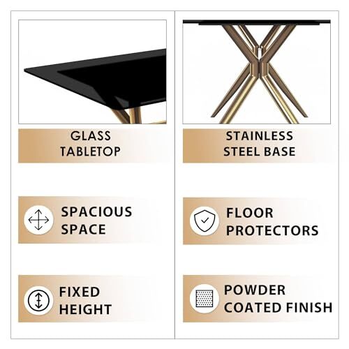 Our dining table showcases a modern design that seamlessly improves any dining area with contemporary charm. Its clean lines and minimalist style serve as a chic centerpiece, and the use of materials like steel, sintered stone or glass, adds functionality to your dining experience. This blend of design and materials contributes to the overall atmosphere of your dining space, making it a stylish addition to your home. The dining kitchen table is supported by a robust gold steel base, ensuring exceptional durability and stability for long-term use. This sturdy foundation, with a maximum capacity of 440 lbs, is designed to withstand everyday wear and tear, providing a sturdy platform for your dining needs. With its wide rectangular top, our dining room table offers ample space for dining or gatherings. This spacious surface provides plenty of room for meals, decorations, and entertainment essentials, making it ideal for hosting gatherings or family dinners. Choose between a durable sintered stone or elegant glass top, each offering unique benefits. The sintered stone top provides heat and scratch resistance, an ideal choice for frequent use. The glass top exudes sophistication with its sleek and reflective surface, adding a touch of elegance to your dining area while creating a visually stunning focal point. The grub screw installation adds extra stability to the modern dining table, ensuring it stays secure and steady during use. This installation method enhances the overall reliability of the dining furniture, providing peace of mind for everyday use. Our contemporary dining table is designed for easy maintenance, requiring only a simple wipe clean with a dry or damp cloth. This hassle-free care routine keeps your table looking pristine and ensures long-term durability. The assembly process is straightforward, with included instructions that make it easy to assemble the kitchen table in no time, allowing you to enjoy its benefits without delay.