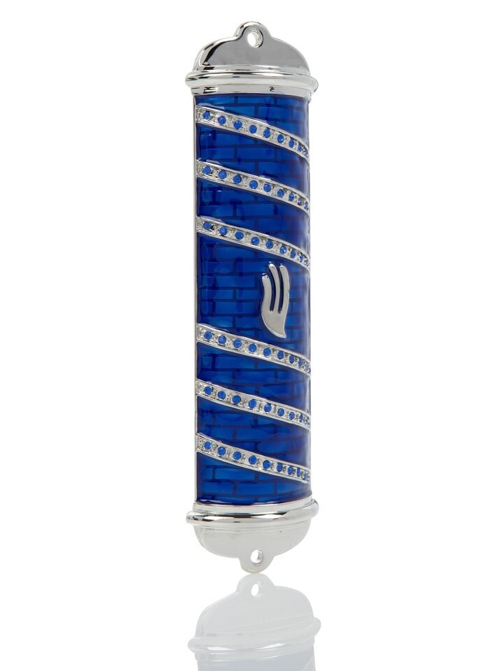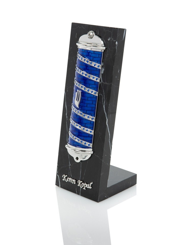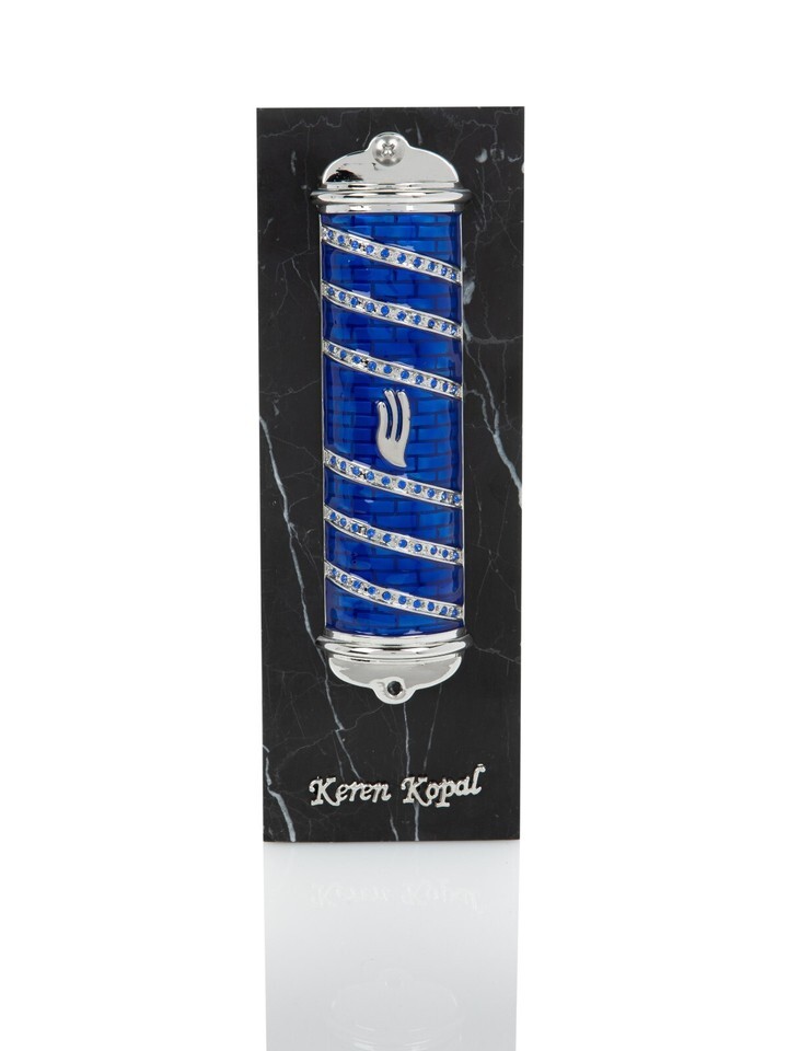 Keren Kopal Hand made Metal Blue mezuzah Decorated with Austrian Crystals