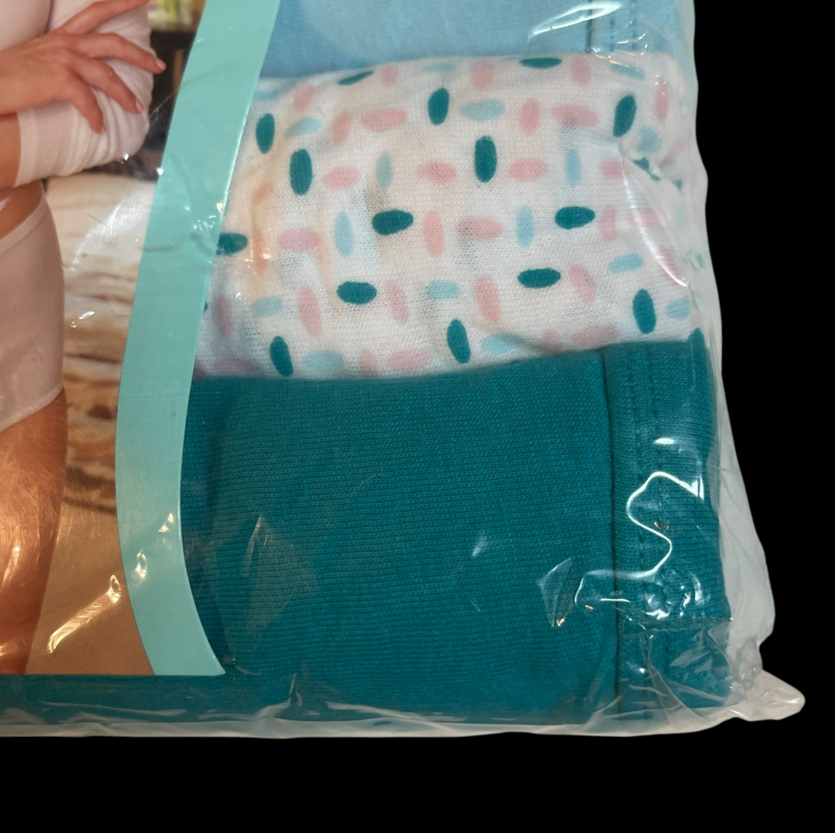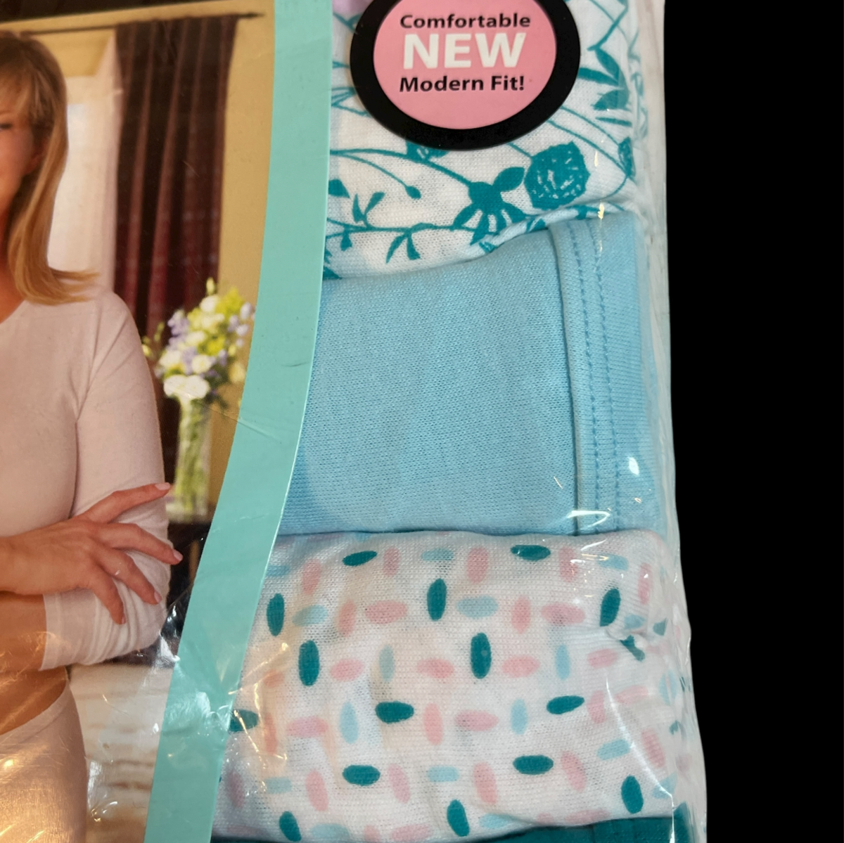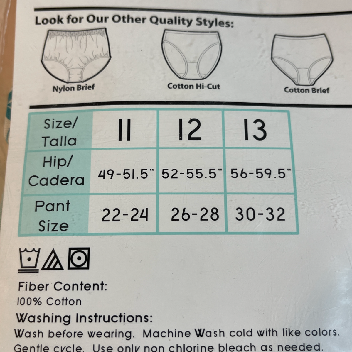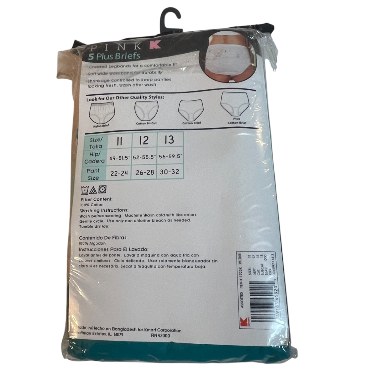 New old stock open package. Pink K (Kmart) 5 plus briefs. 100% cotton label free with soft covered waistband. Plus size 13 (per the sizing chart on back of package: Size 13, fits hip size 56 to 59.5, pant size 30 - 32. Close to a women's plus size 4X to 5X. Includes 5 pairs: pink, mint green, teal green, white teal floral pair, pink white mint green and teal pattern pair. 100% cotton. Please see all gallery photos. We are a smoke free, pet friendly home. Have a great day!