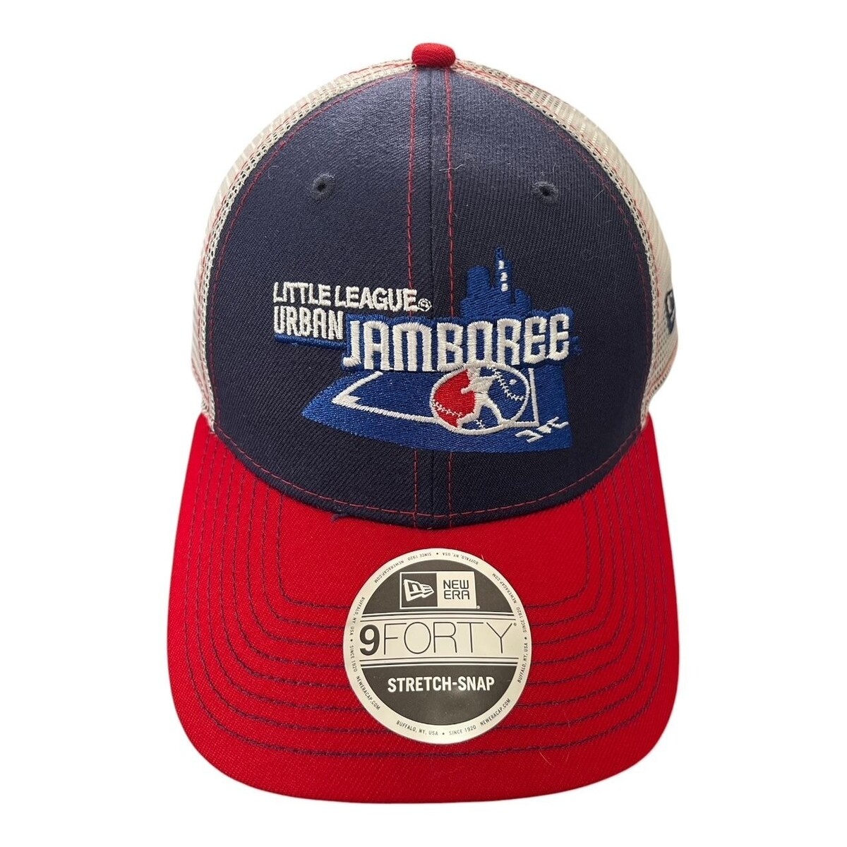 Official New Era 9FORTY Stretch-Snap trucker hat featuring the *Little League Urban Jamboree* logo embroidered on the front. Designed in red, white, and navy blue with a breathable mesh back and adjustable snap closure for a comfortable fit. A sporty collectible hat perfect for baseball fans and Little League supporters alike.