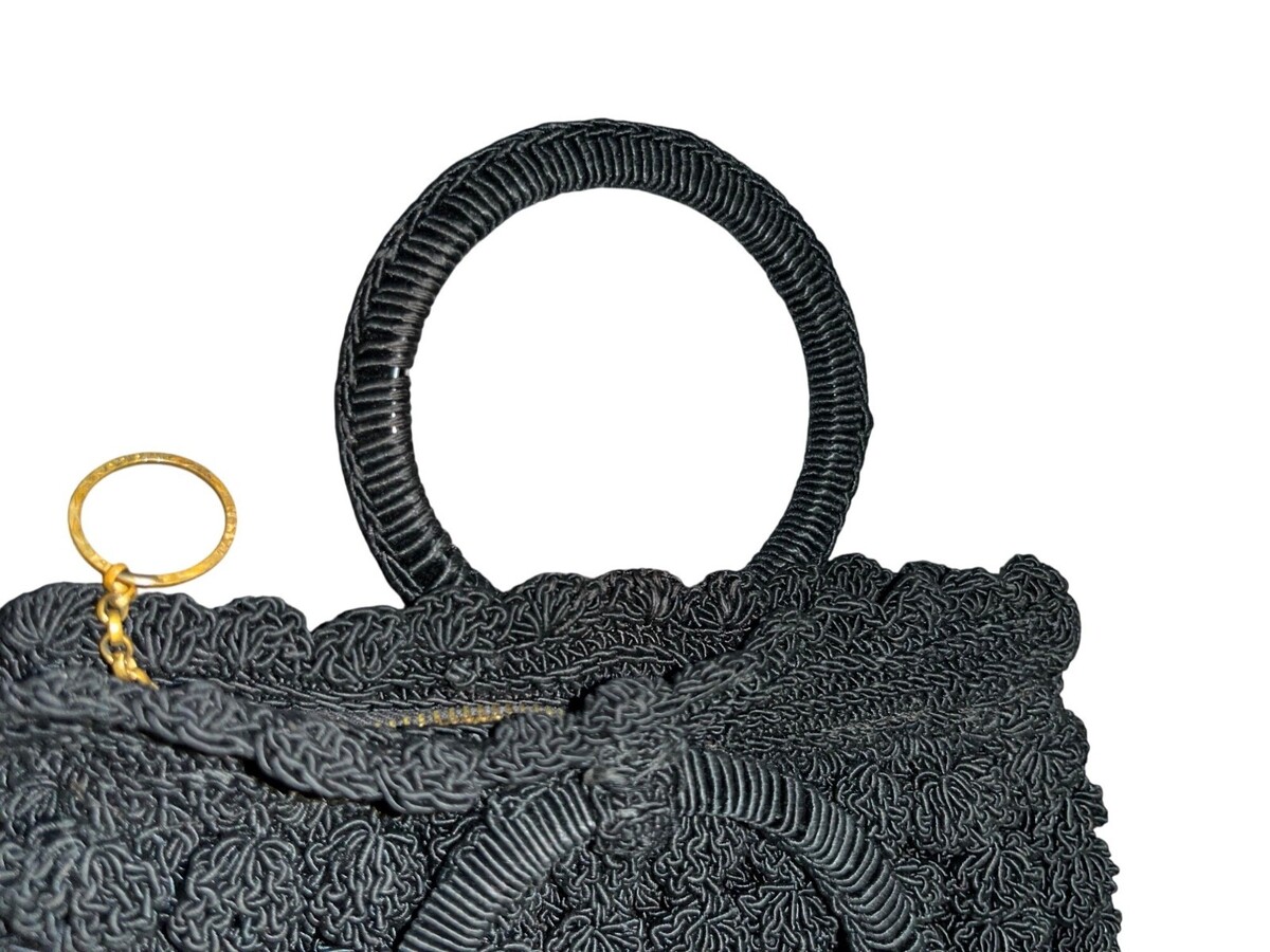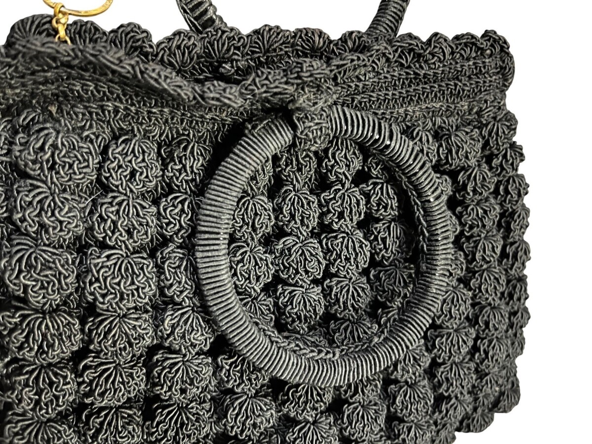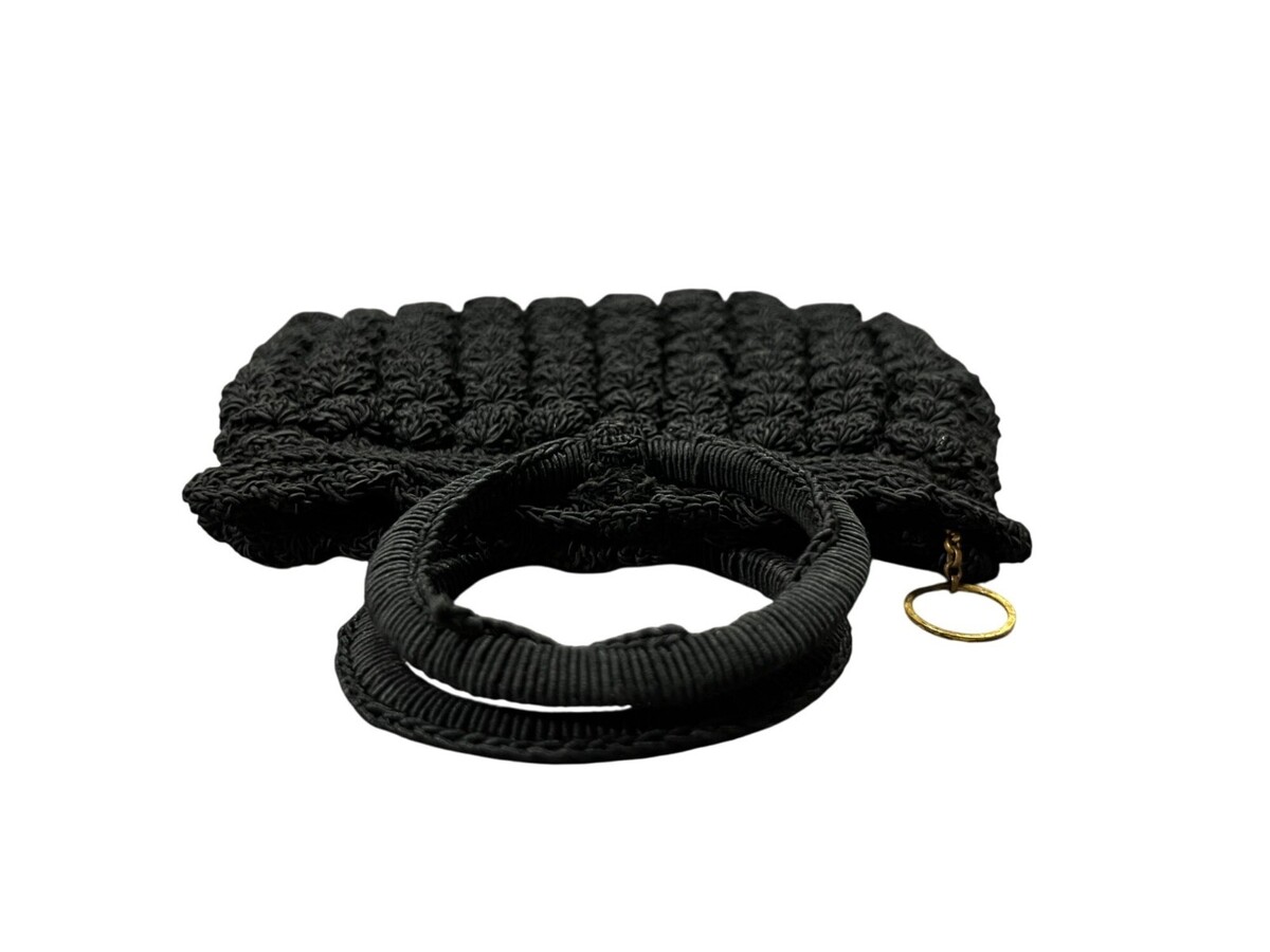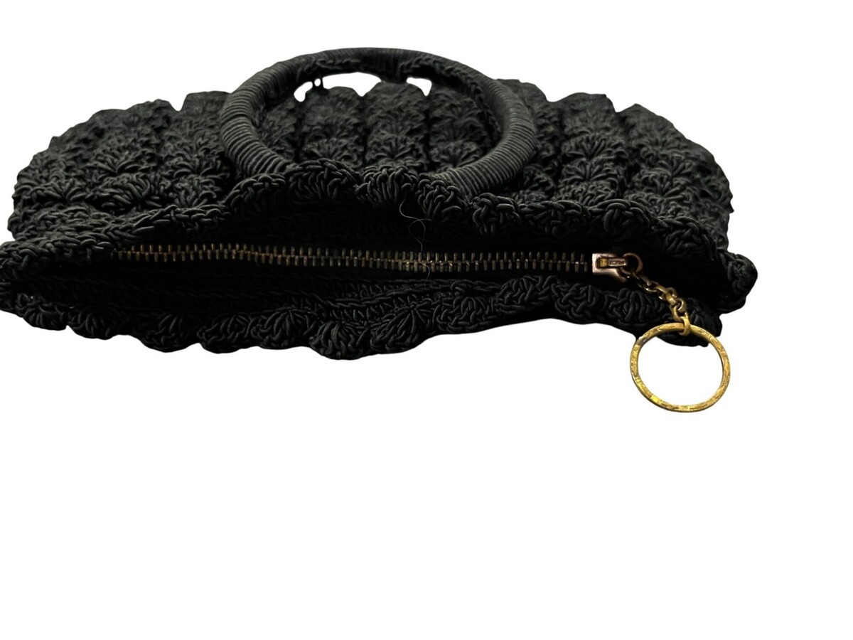 A beautiful example of handcrafted mid-century fashion, this black crochet handbag pairs well with both modern minimalist outfits and retro-inspired looks. Perfect for collectors or as an accent piece for special occasions.