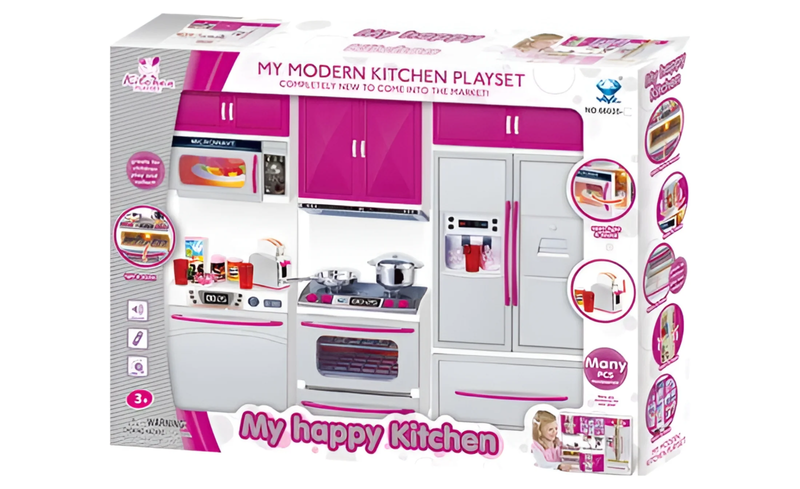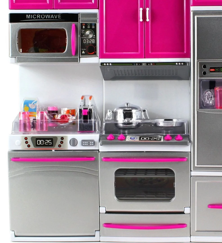 Kitchen Connection My Modern Kitchen Full Deluxe Kit Kitchen Playset: Refrigerator, Stove, Microwave - Pink Silver. This modern kitchen play set comes with appliances that light up and make sounds just like an actual kitchen! The cabinets, microwave, oven, and refrigerator can be opened. The toaster also has a switch that can be pressed to mimic an actual toaster! This play set is perfect for children to play pretend in a mini kitchen! Product: 13.5 x 12