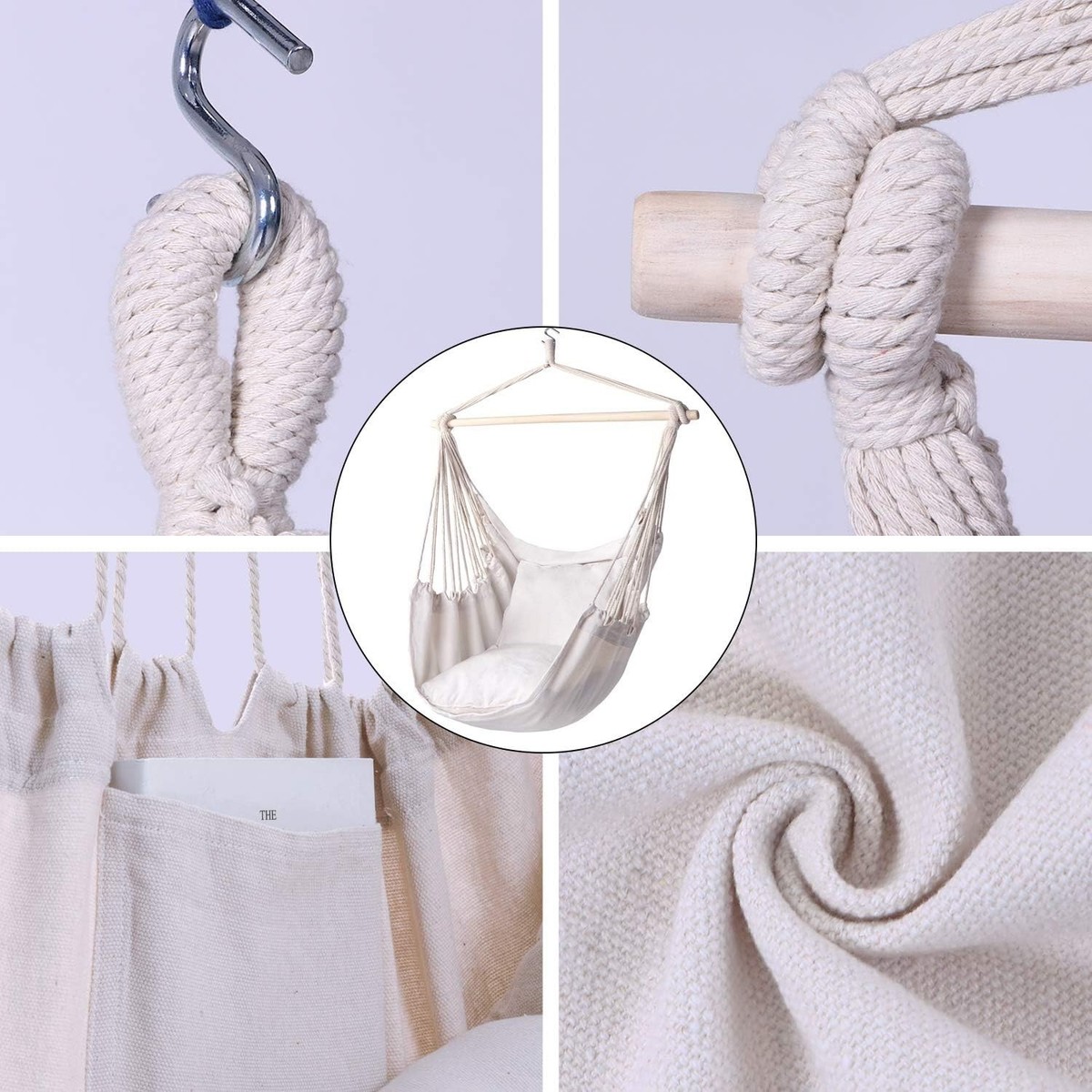 Y- STOP Hammock Chair Hanging Rope Swing, Max 330 Lbs, 2 Cushions Included-Large Hanging Chair with Pocket for Superior Comfort (Beige)